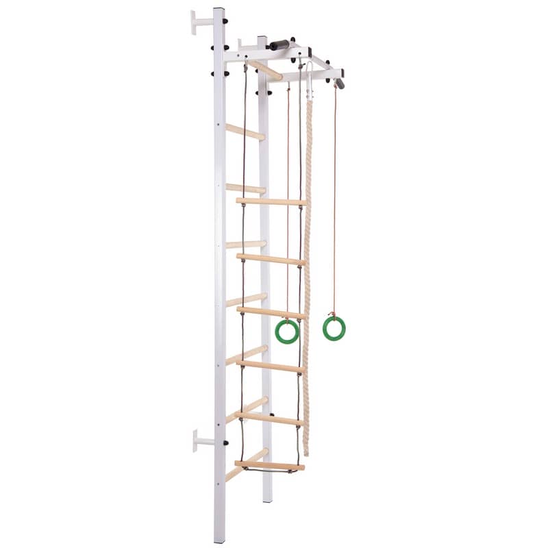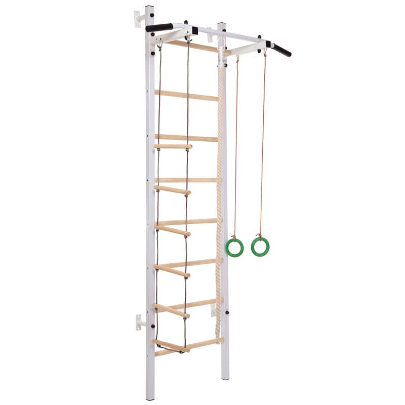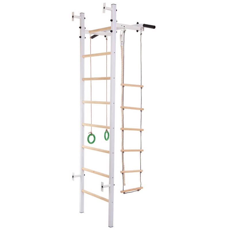 Шведська стінка з набором навісного обладнання дозволить дитині, не виходячи з дому, весело проводити час і активно займатися спортом. Канат для лазіння фіксується на турніку і надійно утримується за допомогою металевого кріплення. Турнік також виконаний з металу. Якісне обладнання підійде для дітей різного віку, в тому числі і підлітків. Попри широкий функціонал, шведська стінка не вимагає багато місця для установки і може використовуватися в домашніх умовах.