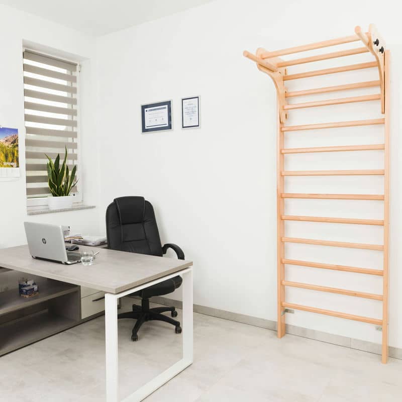 Шведська стіна з аксесуарами для вправ у домашніх умовах допомагає покращити фізичну форму, зміцнити м’язи та покращити баланс. Оснащений підвісною дерев’яною штангою для підтягування, яка легко кріпиться до будь-якої ступені, дозволяючи тренувати м’язи спини та решту верхньої частини тіла. Існують також прості, але надзвичайно практичні поручні. Діти також можуть оцінити інші аксесуари в комплекті – гімнастичні кільця з міцними регульованими ременями та підвісні гойдалки з сидінням 29,5 х 29,5 см. Ви навіть можете повісити штангу на одну з нижніх сходинок і прикріпити до неї стільницю, щоб дитина могла малювати або робити домашнє завдання.