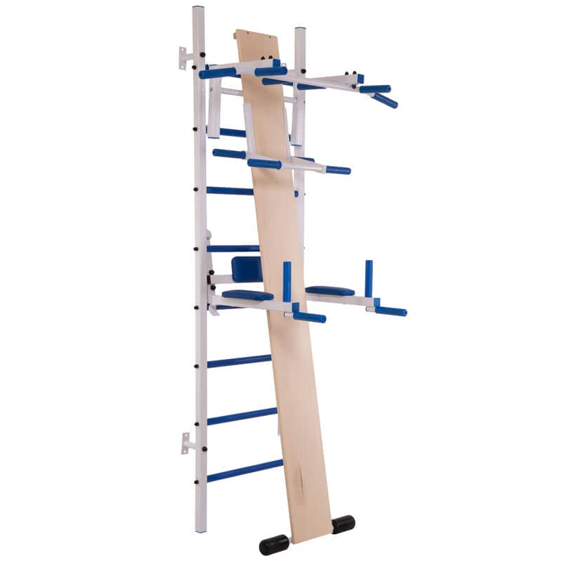 Шведська стінка з набором навісного обладнання встановлюється до стіни. Конструкція виготовлена з металу, поперечні поперечини стінки закриті пластиковими накладками.