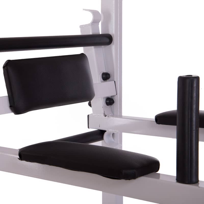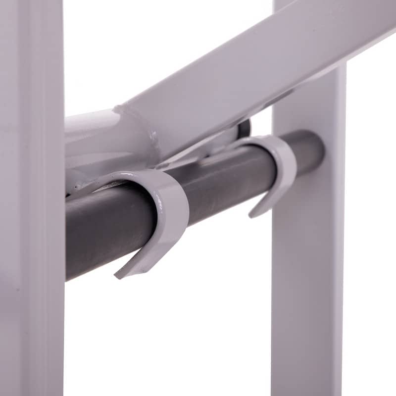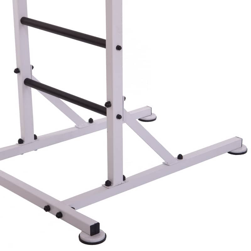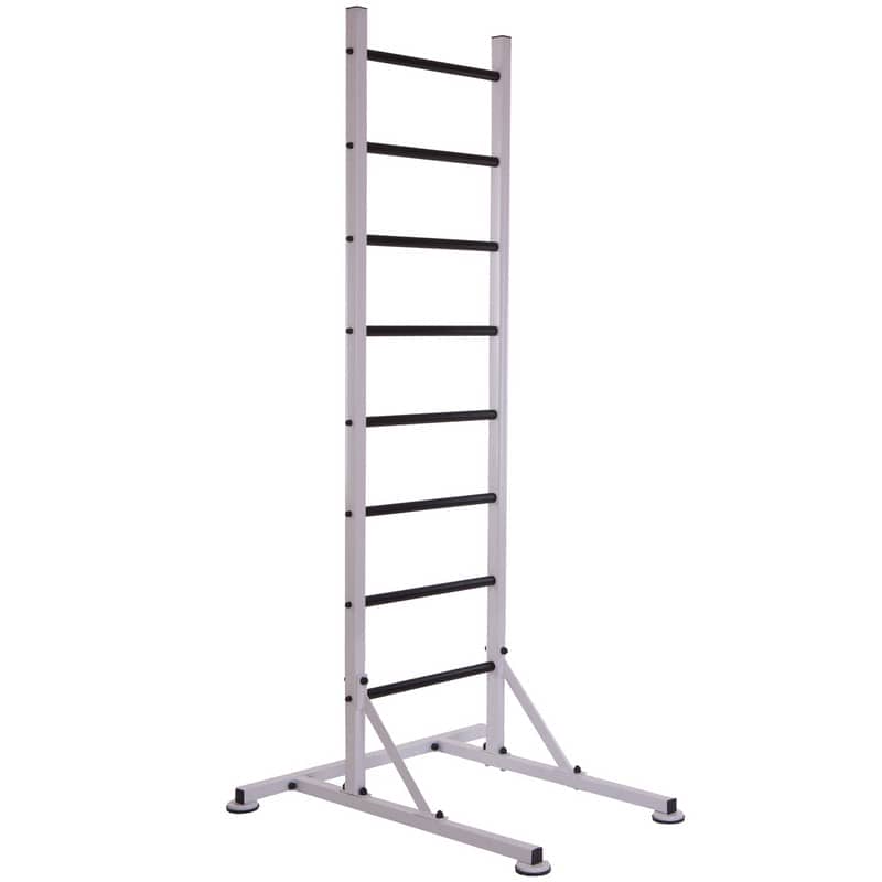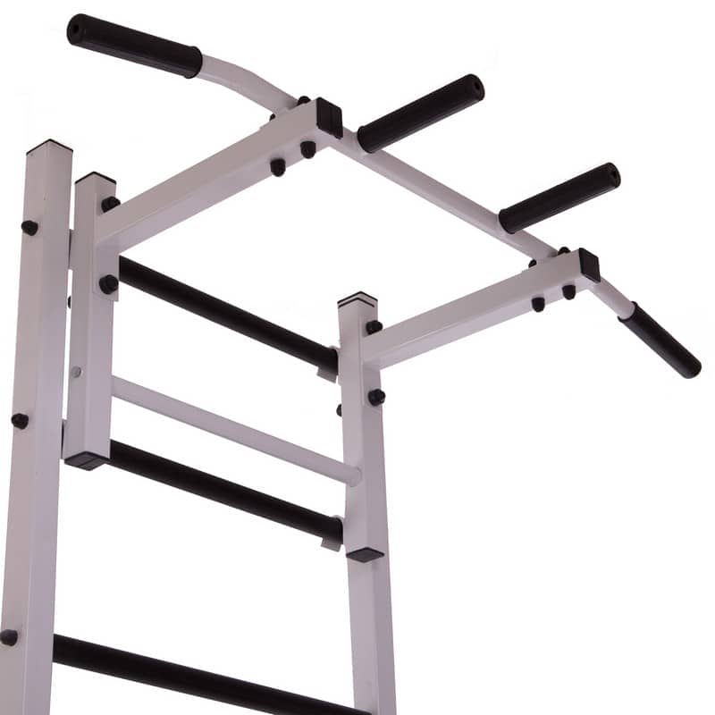У комплект входить металева шведська стійка з широкими опорами та навісне обладнання: турнік, бруси й лава для преса. Стійка стінки виконана з труби посиленого перетину 50*40 мм, що запобігає прогинам, і має підвищену жорсткість. Навісити додаткове обладнання можна на кожну з восьми металевих перекладин в пластиковій оболонці. Це дозволяє регулювати висоту турніка та інших елементів, в точності підлаштовуючи її під зріст користувача.