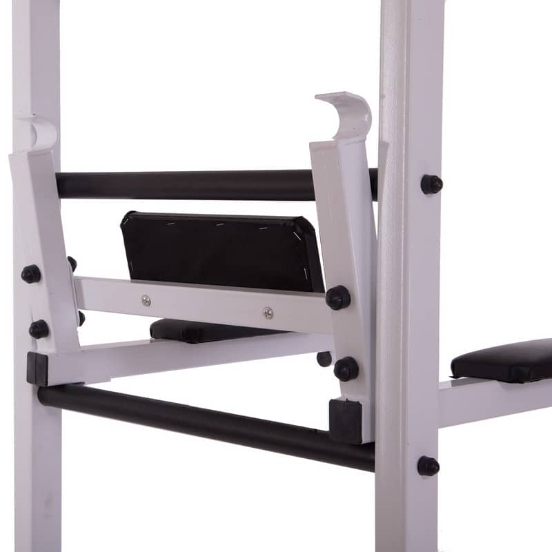 - У комплекті навісний турнік, бруси (в перевернутому положенні служать підставкою під штангу) і лавка для преса.