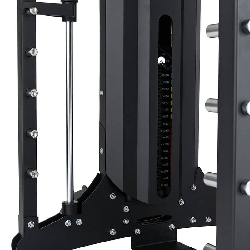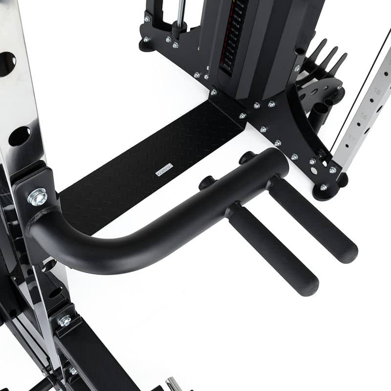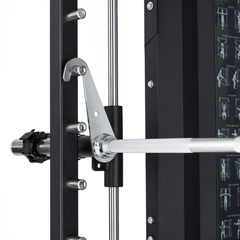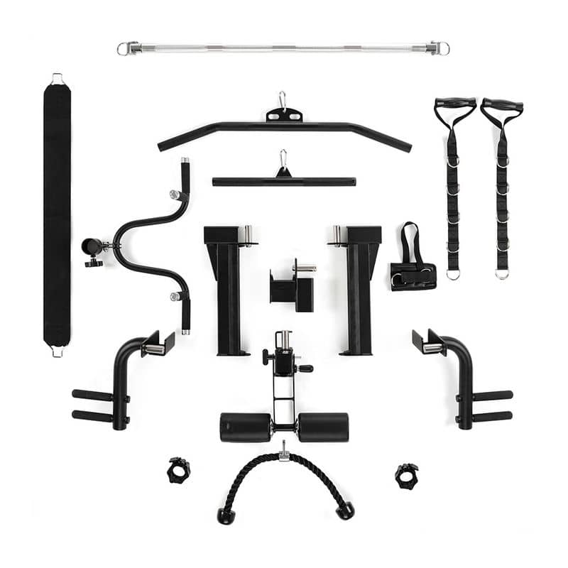 Крім того, вся конструкція поставляється з повним набором аксесуарів, які допоможуть вам досягти найкращої форми. На додаток до системи шківів, ви отримуєте 6 адаптерів, за допомогою яких ви можете почати тягнути вниз верхній і нижній шківи, як обома руками, так і кожною рукою окремо. Крім того, в комплекті є тримачі та обмежувачі для штанги, знімні багатофункціональні грифи, регульована підставка для ніг та рухомий адаптер для олімпійської штанги. Тож нудьгувати точно не доведеться!