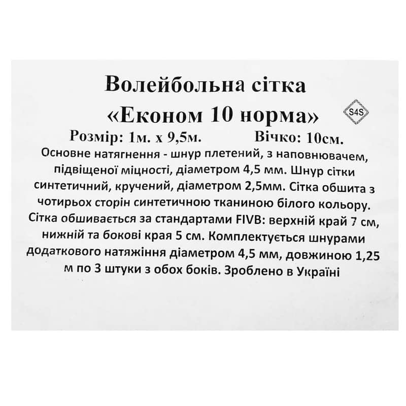 Сітка для волейболу PlayGame Економ10 норма 9,5x1,0м білий, код: SO-9550_W