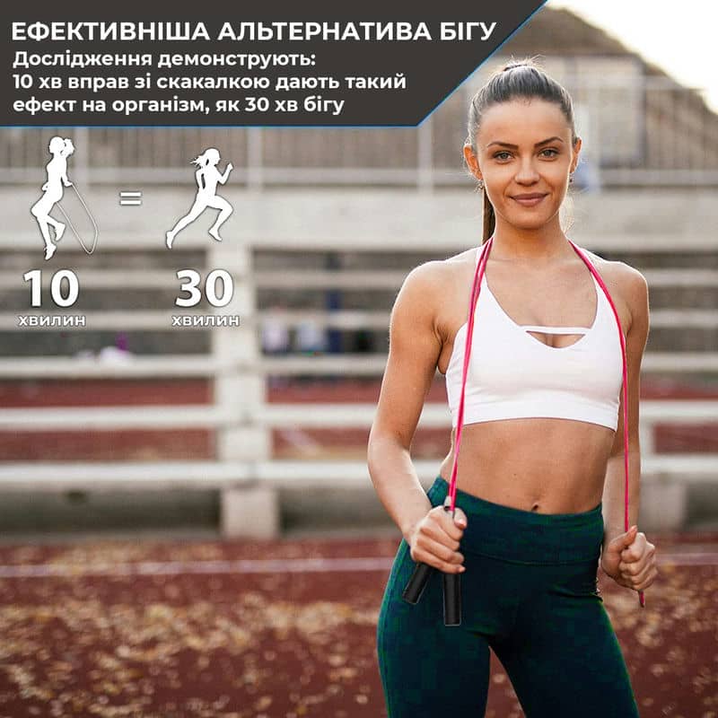 Дослідження показують, що стрибати на скакалці протягом 10 хвилин дорівнює бігу протягом 30 хвилин! Навіть краще, якщо зіставивши з іншими формами кардіо: аеробіка, їзда на велосипеді, веслування, сходинки, плавання, йога, і список можна продовжувати; ніхто не може порівнятись з перевагами стрибків зі скакалкою! Стрибки спалюють більше калорій за хвилину і залучають більшу кількість м’язів!