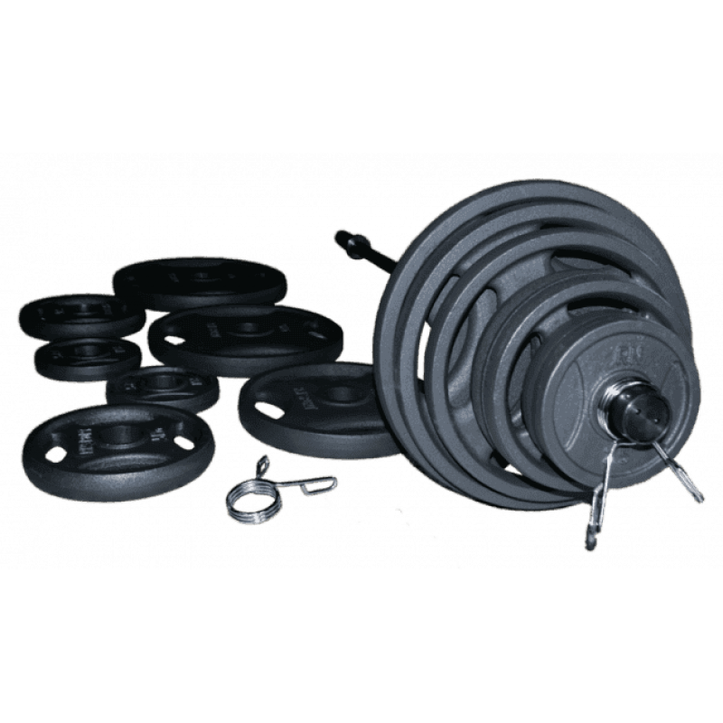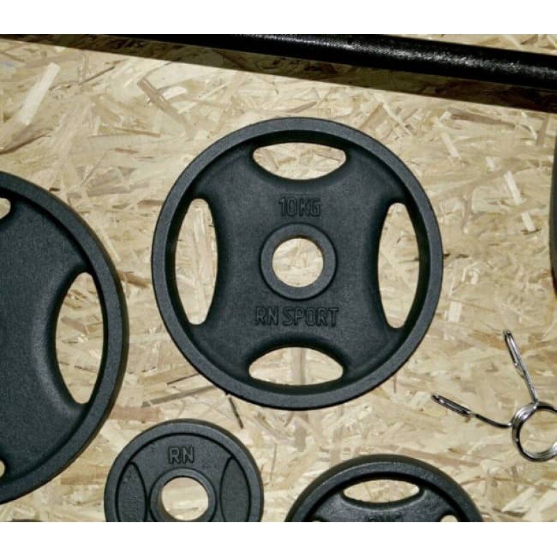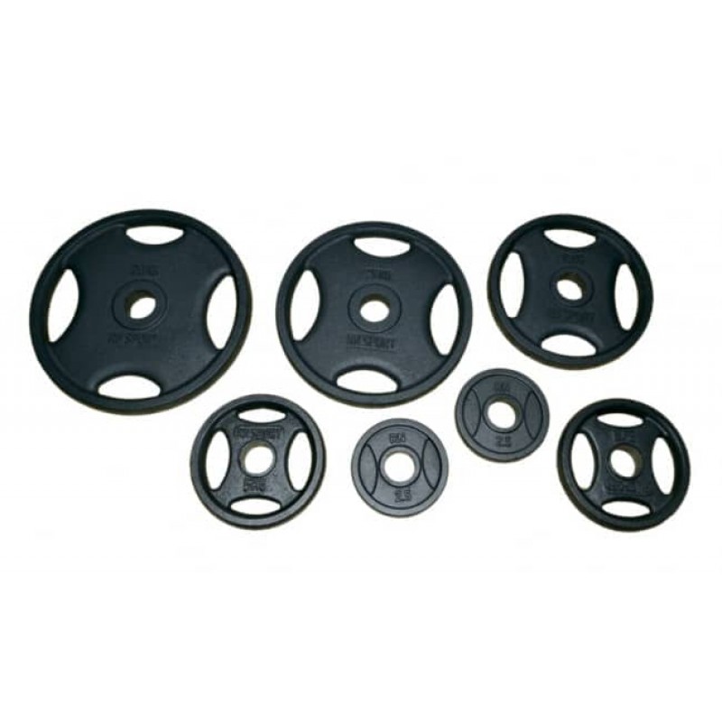 Диски виготовлені із металу. Після обробки диски розігрівають у печі до температури 180-200 градусів, фарбують удароміцною фарбою і знову запікають до формування міцної кірки. Завдяки дискам вагою 2.5 кг можна тренуватися з мінімальним кроком ваги. Зручності у використанні додає металеві хромовані грифи з насічкою проти ковзання рук та двома затискними гайками, які мають гумові втулки для щільної та надійної фіксації млинців.