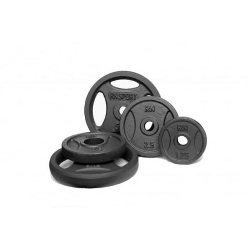 Млинці виготовлені із металу. Після обробки диски розігрівають у печі до температури 180-200 градусів, фарбують удароміцною фарбою і знову запікають до формування міцної кірки. Завдяки дискам вагою 2.5 кг можна тренуватися з мінімальним кроком ваги. Зручності у використанні додає металеві хромовані грифи з насічкою проти ковзання рук та двома затискними гайками, які мають гумові втулки для щільної та надійної фіксації млинців.
