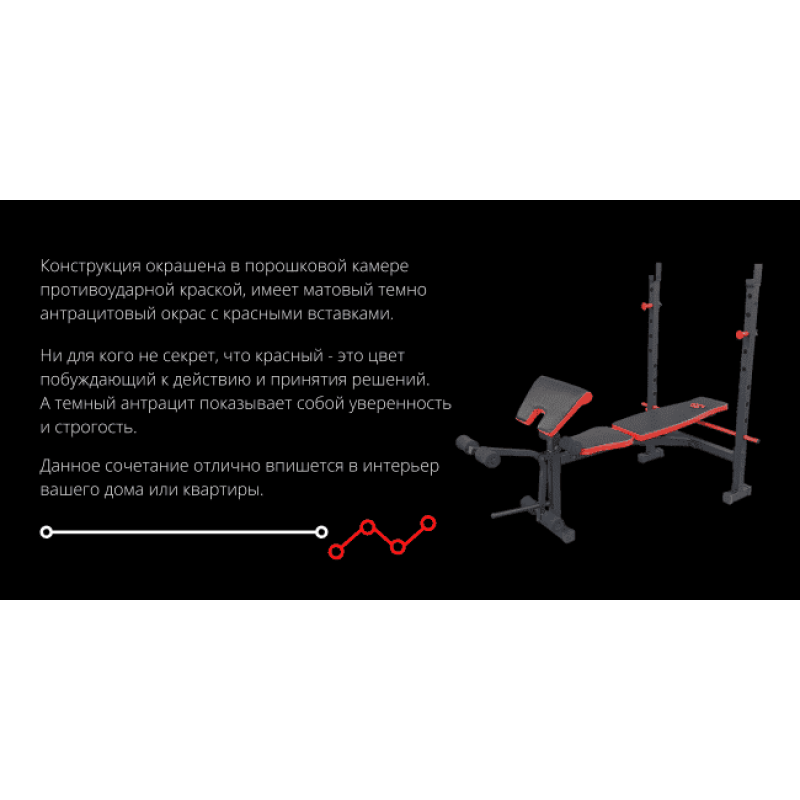 Рама тренажера виготовлена з металевого профілю 50х50мм, а м'які частини із зносостійкого поролону та якісної шкіри замінника. Прошивка оббивки із міцної вінілової шкіри виконана подвійним швом. Для зручності та комфорту під час тренувань, спинка та сидіння оббиті Сіткою air-mesh. Така конструкція забезпечує міцність, постійну циркуляцію повітря. Вона надає амортизуючі властивості.