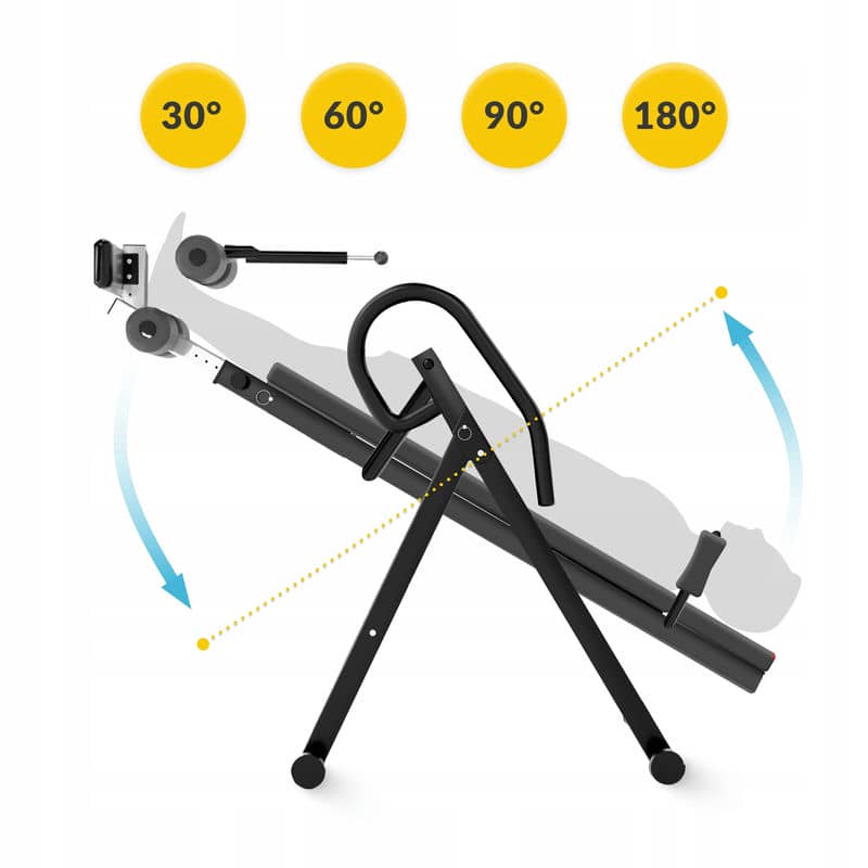 В основі інверсійного тренажера від 4Fizjo використовується високоякісний сталевий профіль, тому максимальне навантаження на конструкцію становить до 150 кг. Обладнання оснащене системою зміни кута нахилу, а завдяки наявній 4-ступеневій шкалі можна плавно перевести лаву в перевернуте положення, обравши кут нахилу - 30°, 60°, 90° або 180°. Більший кут забезпечує кращий розслаблюючий ефект для хребта. Крім того, тренажер має регулювання під зріст користувача з максимальним значенням у 190 см. Якісна та приємна на дотик оббивка з екошкіри наповнена стійкою до деформації, м'якою піною, що гарантує комфорт використання. Закінчивши тренування ви можете з легкістю скласти тренажер та сховати у зручному місці.