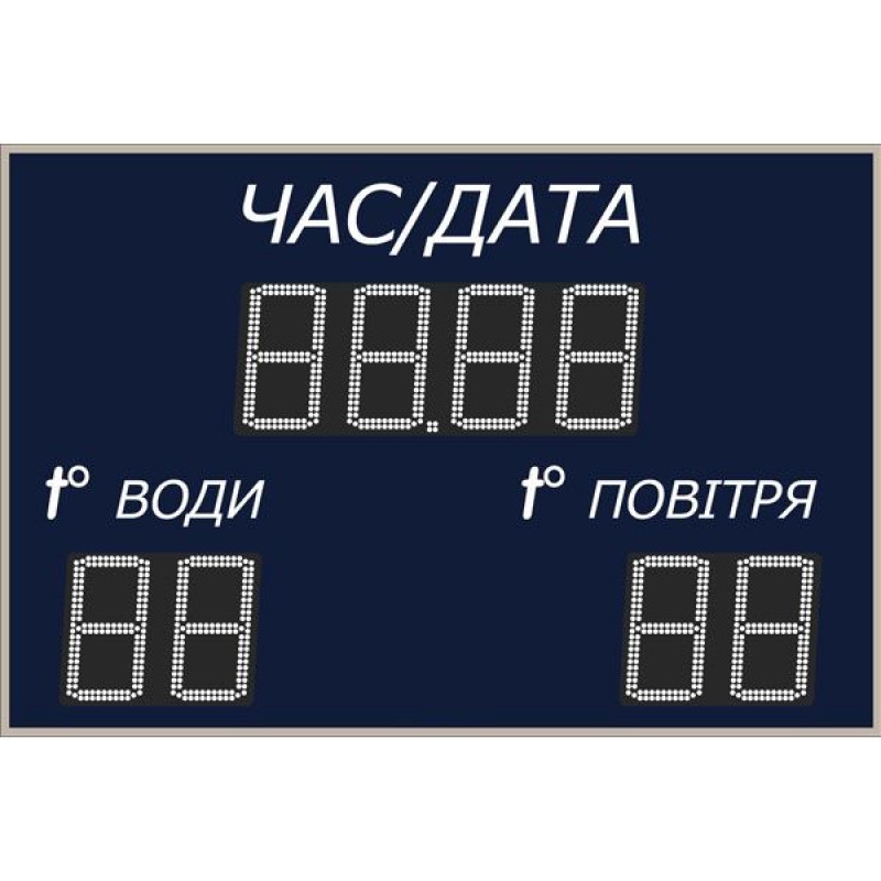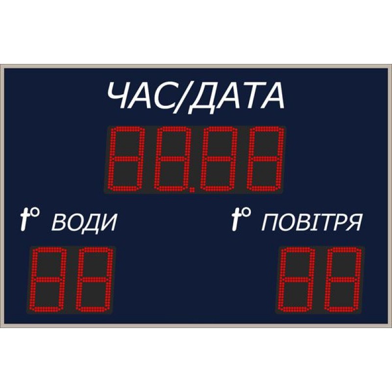 Широка гамма кольорів дозволяє вписати це табло в дизайн будь-якого інтер'єру. Ручне регулювання яскравості світіння і можливість підключення GPS модуля для супутникової синхронізації часу, дозволяє комфортно і точно контролювати час і температуру. Під час налаштування табло для басейну в пам'ять заноситься значення температури води, виміряної іншим термометром. На табло передбачений режим секундоміра, в якому при натисканні кнопки СТАРТ починається відлік часу від нульового значення. Відлік часу можна призупинити і відновити, або скинути на нульове значення. Через годину відлік триває спочатку. Комплект поставки: табло для басейну; пульт таймерний; паспорт та інструкція з експлуатації; захисна упаковка. Пульт управління табло і інструкція знаходяться всередині коробки. Цифровий датчик температури води купується окремо. Висота всіх цифрових символів: 250 мм, дальність видимості до 100 метрів. Елемент індикації: світлодіод 5 мм. Яскравість світіння світлодіодів (залежить від кольору): 0,9-2,5 Кд. Кількість градацій яскравості: 8. Загальна тривалість ходу годинника без живлення: до 15 днів. Матеріал рами: сталь. Матеріал корпусу: анодований алюміній. Лицьова панель: оргскло із захисною плівкою. Температура експлуатації: від 0 до +60°С. Напруга живлення: 220 В. Потужність в робочому режимі: до 50 Вт. Тип кріплення: настінний. Дальність роботи ІК пульта: до 10 метрів. Габарити табло в упаковці: 1600х1050х75 мм.