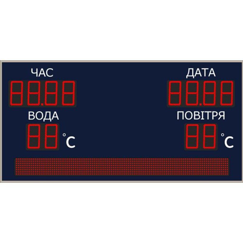 Табло, для виведення текстових повідомлень, може управлятися з планшета або смартфона по мережі Wi-Fi, або по дроту від комп'ютера або планшета. Температура води виводиться або з датчика температури, або, при відключенні датчика, з пам'яті табло. Одного разу введені на інформаційний рядок повідомлення, можна зберегти в пам'яті керуючого планшета і виводити за потребою. Бездротове управління дозволяє управляти табло зі зручного місця без необхідності плутатися в проводах. Це рішення підвищує експлуатаційну надійність і виводить комфорт в роботі на новий рівень. Програму можна встановити на смартфон і забути про пошук системи управління - все відбувається максимально оперативно! На вимогу, колір фону і світіння на табло може бути адаптований до кольорової гами саме Вашого басейну. Це збільшить термін відвантаження на 5 робочих днів. Комплект поставки: інформаційне табло для басейну; датчик температури води; планшет з програмою; паспорт та інструкція з експлуатації; захисна упаковка. Висота всіх цифрових символів: 210 мм, дальність видимості до 80 метрів. Елемент індикації: світлодіод 5 мм. Яскравість світіння світлодіодів (залежить від кольору): 0,4-1,5 Кд. Кількість градацій яскравості: 8. Розширення інформаційного рядка: 8х112 пікселів. Розмір шрифтів: вузький/широкий. Тип застосовуваних шрифтів: кирилиця/латинський. Кількість знаків на інформаційному рядку: 14 шт. вузьким шрифтом, 18 шт. широким шрифтом. Тривалість ходу годинника без живлення: до 15 днів. Збереження ігрових налаштувань: необмежено. Матеріал рами: сталь. Матеріал корпусу: анодований алюміній. Лицьова панель: оргскло із захисною плівкою. Температура експлуатації: від 0 до +60°С. Напруга живлення: 220 В. Потужність в робочому режимі: до 120 Вт. Тип кріплення: настінний. Дальність роботи планшета: до 50 метрів. Габарити табло в упаковці: 2100х1050х75 мм.
