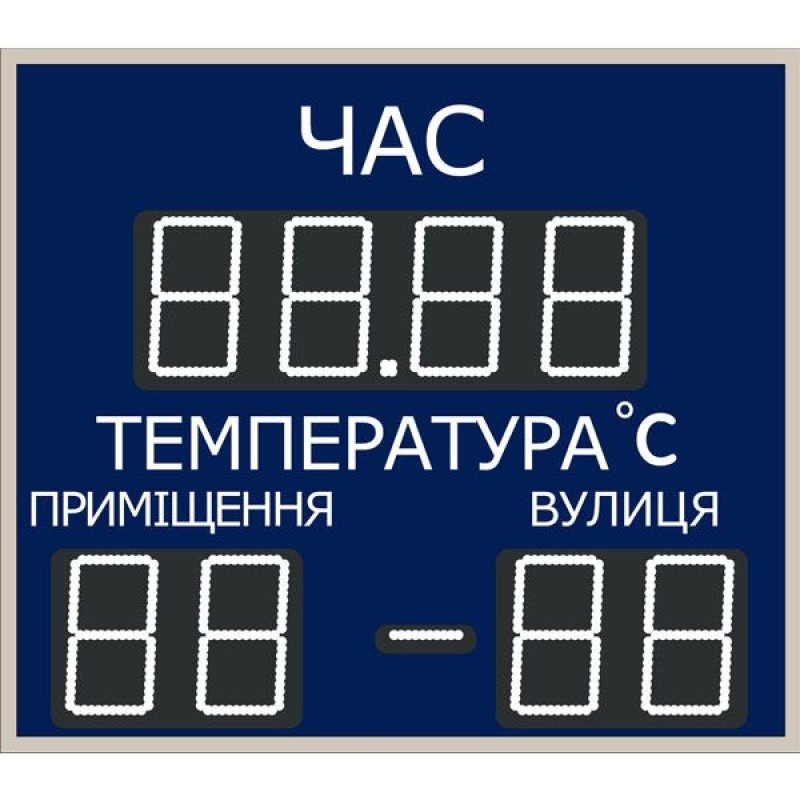 Після установки табло не вимагає особливого технічного обслуговування протягом всього терміну служби. Передбачена багатоступенева синхронна регулювання яскравості світіння цифр часу і температури. Робота в режимі циклічного керованого секундоміра дозволяє тренерам і адміністрації басейну чітко контролювати тривалість занять з водних видів спорту або час перебування у воді груп плавців. При відключенні датчика температури повітря на вулиці, табло автоматично переходить в режим відображення значення температури, попередньо записаного в пам'яті табло. Комплект поставки: табло для басейну; ІК пульт таймерний; паспорт та інструкція з експлуатації; захисна упаковка. Датчик температури повітря на вулиці з кабелем купується окремо. Висота цифрових символів: 150 мм, дальність видимості до 60 метрів. Елемент індикації: світлодіод 5 мм. Яскравість світіння світлодіодів (залежить від кольору): 1,0-3,5 Кд. Кількість градацій яскравості: 8. Загальна тривалість ходу годинника без живлення: до 15 днів. Матеріал рами: алюміній. Матеріал корпусу: анодований алюміній. Лицьова панель: оргскло із захисною плівкою. Температура експлуатації: від -30 до +60°С. Напруга живлення: 220 В. Потужність в робочому режимі: до 45 Вт. Тип кріплення: настінний. Дальність роботи ІК пульта: до 10 метрів. Габарити табло в упаковці: 870х740х75 мм.