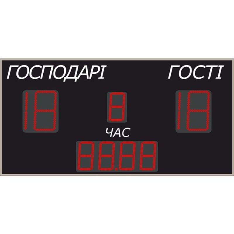 Табло підходить для невеликих стадіонів та тренувальних майданчиків для багатьох популярних командних ігор. Управляється з невеликого радіо-пульта. При включеному в мережу табло можливо дистанційне перемикати режиму роботи: ігровий режим - астрономічний час - вимкнено. Передбачено підключення дротяного пульта управління. Можливості виведення інформації на табло для футболу: час тайму і час перерви (прямий і зворотний відлік) або годинник точного астрономічного часу; рахунок в грі (0-19); номер поточного тайму. Комплект поставки: світлодіодне табло для футболу; пульт керування; паспорт та інструкція з експлуатації; захисна упаковка. Висота цифр РАХУНОК: 350 мм, дальність видимості до 120 метрів. Висота цифр ЧАС, ТАЙМ: 250 мм, дальність видимості до 100 метрів. Елемент індикації: світлодіод 5 мм. Яскравість світіння світлодіодів (залежить від кольору): 2,4-3,5 Кд. Максимальна тривалість тайму: 59 хв. Максимальна тривалість перерви: 59 хв. Тривалість ходу годинника без живлення: до 15 днів. Збереження ігрових налаштувань: необмежено. Матеріал рами: сталь. Матеріал корпусу: анодований алюміній. Лицьова панель: оргскло із захисною плівкою. Температура експлуатації: від -35 до +60°С. Напруга живлення: 220 В. Потужність в робочому режимі: до 100 Вт. Енергоспоживання в режимі годинника: до 50 Вт. Тип кріплення табло: настінне. Дальність роботи оператора від табло: до 50 метрів. Габарити табло в упаковці: 2100х1050х75 мм.