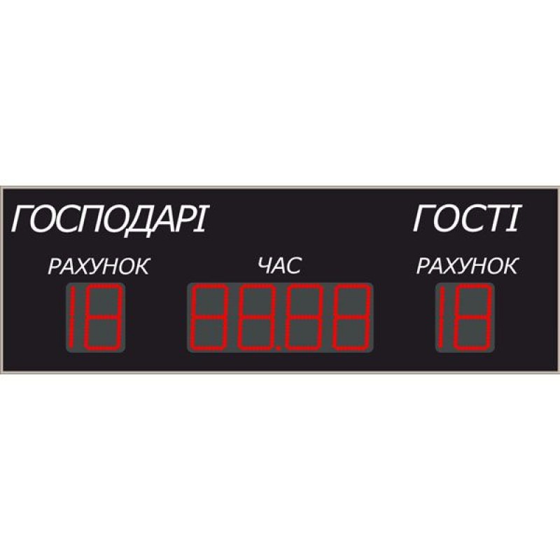 Табло початкового рівня з дальністю видимості до 120 метрів. Використовуються світлодіоди білого, червоного або зеленого кольору, розраховані для роботи в умовах високої освітленості. Управління з дротяного пульта зі світлодіодним дисплеєм або радіопульта. Просте, надійне і невибагливе в роботі. Кріпиться на рівну стіну або металевий каркас конструкції. Мале енергоспоживання і строгий дизайн прикрасять невеликий стадіон або тренувальний майданчик. Комплект поставки: світлодіодне табло для футболу; пульт керування; паспорт та інструкція з експлуатації; захисна упаковка. Висота цифр РАХУНОК, ЧАС: 350 мм, дальність видимості до 120 метрів. Елемент індикації: світлодіод 5 мм. Яскравість світіння світлодіодів (залежить від кольору): 0,4-3,5 Кандел. Максимальна тривалість тайму: 59 хв. Максимальна тривалість перерви: 59 хв. Тривалість ходу годинника без живлення: до 15 днів. Збереження ігрових налаштувань: необмежено. Матеріал рами: сталь. Матеріал корпусу: анодований алюміній. Лицьова панель: оргскло із захисною плівкою. Температура експлуатації: від -40 до +60°С. Напруга живлення: 220 В. Потужність в робочому режимі: до 100 Вт. Енергоспоживання в режимі годинника: до 50 Вт. Тип кріплення табло: настінне/металокаркас. Дальність роботи радіопульта: до 50 метрів. Габарити табло в упаковці: 3000х1100х140 мм.