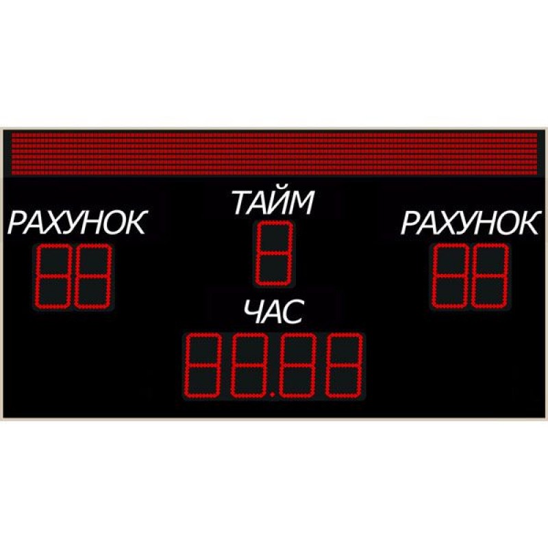 Табло має інформаційний рядок для виведення назв команд, індикацію рахунку, тайму і часу гри або астрономічного часу. Управління з планшета без проводів по мережі Wi-Fi. Передбачено управління від дротяного пульта з автоматичним вибором джерела сигналу. На інформаційному рядку передбачено виведення: назв команд; інформаційних повідомлень з різними ефектами; коротких ігрових повідомлень (настроюється). Таймер на табло може працювати в прямому (на збільшення від 00-00), зворотному (від заданого значення до 00-00) режимі, і в режимі індикації астрономічного часу. У поставку входять елементи кріплення на стіну, але можливе кріплення на металеву конструкцію за допомогою болтів М8. Комплект поставки: світлодіодне табло для футболу; пульт-планшет; паспорт та інструкція з експлуатації; захисна упаковка. Висота цифр РАХУНОК, ЧАС: 350 мм, дальність видимості до 120 метрів. Висота цифр ТАЙМ: 250 мм, дальність видимості до 100 метрів. Висота символів інформаційного рядка: 220 мм, дальність видимості до 80 метрів. Елемент індикації: світлодіод 5 мм. Яскравість світіння світлодіодів (залежить від кольору): 1,4-3,5 Кд. Максимальна тривалість тайму: 59 хв. Максимальна тривалість перерви: 59 хв. Тривалість ходу годинника без живлення: до 15 днів. Збереження ігрових налаштувань: необмежено. Матеріал рами: сталь. Матеріал корпусу: анодований алюміній. Лицьова панель: оргскло із захисною плівкою. Температура експлуатації: від -35 до +65°С. Напруга живлення: 220 В. Потужність в робочому режимі: до 240 Вт. Енергоспоживання в режимі годинника: до 50 Вт. Тип кріплення табло: настінне або на металокаркас. Дальність роботи оператора від табло: до 50 метрів. Габарити табло в упаковці: 3000х1700х140 мм.