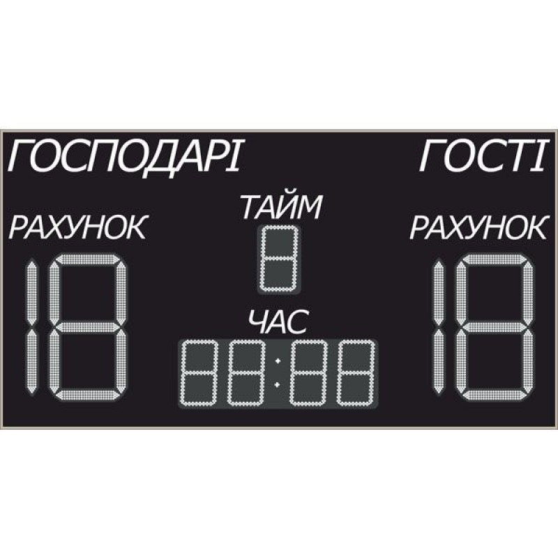 Особливістю цієї моделі табло для футболу є великі цифри рахунку з дальністю перегляду до 300 метрів. Рахунок гри в спортивних командних змаганнях є головним досягненням для кожної команди, і на спортивних табло, як правило, цифри в полi рахунку більшi, ніж цифри на інших полях. Табло має кілька каналів управління: провідний; радіопульт; з планшета або смартфона по мережі Wi-Fi. Стандартне кріплення - настінне, передбачена можливість кріплення на металокаркас. Жорстка об'ємна сталева рама і облицювання з анодованого алюмінію забезпечать безвідмовну роботу табло на багато років. Футбольне табло цієї моделі - одномодульне. Поставка складається з самого табло, в індивідуальній картонній упаковці, і картонної коробки з комплектацією. Комплект поставки: світлодіодне табло для футболу; пульт-планшет з програмою; паспорт та інструкція з експлуатації. Висота цифр РАХУНОК 800 мм, дальність видимості до 300 метрів. Висота цифр ТАЙМ і ЧАС 350 мм, дальність видимості до 120 метрів. Елемент індикації: світлодіод 5 мм. Яскравість світіння світлодіодів (залежить від кольору): 2,0-3,3. Максимальна тривалість тайму 59 хв. Максимальна тривалість перерви: 59 хв. Тривалість хода годин без живлення: до 15 днів. Збереження ігрових налаштувань: необмежено. Матеріал рами: сталь. Матеріал корпусу: анодований алюміній. Лицьова панель: оргскло із захисною плівкою. Температура експлуатації: від -40 до + 60°С. Напруга живлення: 220 В. Потужність в робочому режимі: до 180 Вт. Енергоспоживання в режимі годинника: до 45 Вт. Тип кріплення табло: настінне або на металокаркас. Дальність роботи оператора від табло: до 50 метрів. Габарити табло в упаковці: 3000х1700х140 мм.