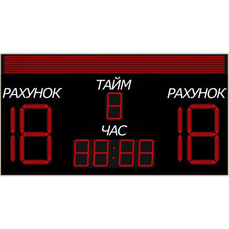 Ця модель відрізняється великими цифрами рахунку при компактних (для стадіону) розмірах. Великі цифри дозволяють комфортно сприймати інформацію, виведену на табло. Підтримується одночасно Ethernet та бездротове управління табло з кнопкового пульта з індикатором або планшета відповідно. Електронне табло складається з модуля табло в індивідуальній упаковці та коробки з усім необхідним для управління спортивним табло і інструкцією. Комплект поставки: світлодіодне табло для футболу; пульт управління табло для футболу; кабель інформаційний (30 м); паспорт та інструкція з експлуатації. Висота цифр РАХУНОК: 800 мм, дальність видимості до 300 метрів. Висота цифр ТАЙМ і ЧАС: 350 мм, дальність видимості до 120 метрів. Висота символів інформаційного рядка: 230 мм, дальність видимості до 80 метрів. Елемент індикації: світлодіод 5 мм. Яскравість світіння світлодіодів (залежить від кольору): 0,4-3,5 Кд. Максимальна тривалість тайму: 59 хв. Максимальна тривалість перерви: 59 хв. Тривалість ходу годинника без живлення: до 15 днів. Збереження ігрових налаштувань: необмежено. Матеріал рами: сталь. Матеріал корпусу: анодований алюміній. Лицьова панель: оргскло із захисною плівкою. Температура експлуатації: від -40 до +60°С. Напруга живлення: 220 В. Потужність в робочому режимі: до 250 Вт. Енергоспоживання в режимі годинника: до 50 Вт. Тип кріплення табло: настінне/металокаркас. Дальність роботи оператора від табло: до 30 метрів. Габарити табло в упаковці: 3000х1700х140 мм.