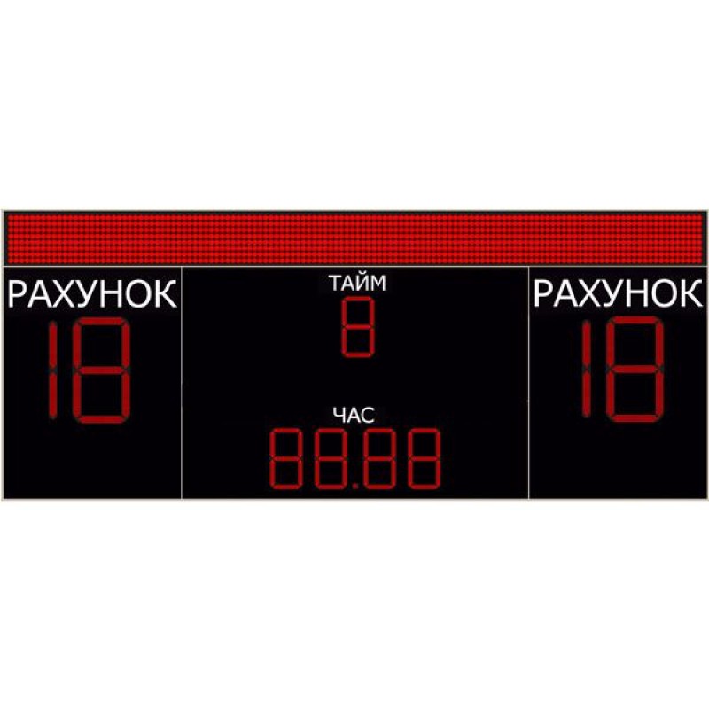 Дана модель футбольного табло має ряд додаткових функцій: можливість управління по мережі Wi-Fi з ноутбука або планшета; підключення GPS модуля для особливо точного астрономічного часу; можливість установки в єдиній з табло конструкції рекламних панелей. Базовий комплект поставки включає пульт для управління табло, клавіатуру і інформаційний кабель. Рекомендована висота установки від 3 метрів до нижнього зрізу табло. Табло складається з п'яти модулів в індивідуальній упаковці та коробки з усім необхідним для управління футбольним табло і інструкцією. Комплект поставки: модуль РАХУНОК 2 шт; центральний модуль; модуль інформаційного рядка 2 шт; пульт управління табло для футболу; кабель інформаційний (30 м); паспорт та інструкція з експлуатації. Висота цифр РАХУНОК: 800 мм, дальність видимості до 300 метрів. Висота цифр ТАЙМ і ЧАС: 350 мм, дальність видимості до 120 метрів. Висота символів інформаційного рядка: 280 мм, дальність видимості до 100 метрів. Елемент індикації: світлодіод 5 мм. Яскравість світіння світлодіодів (залежить від кольору): 1,4-3,5 Кд. Максимальна тривалість тайму: 59 хв. Максимальна тривалість перерви: 59 хв. Тривалість ходу годинника без живлення: до 15 днів. Збереження ігрових налаштувань: необмежено. Матеріал рами: сталь. Матеріал корпусу: анодований алюміній. Лицьова панель: оргскло із захисною плівкою. Температура експлуатації: від -40 до +60°С. Напруга живлення: 220 В. Потужність в робочому режимі: до 440 Вт. Енергоспоживання в режимі годинника: до 50 Вт. Тип кріплення табло: настінне/металокаркас. Дальність роботи оператора від табло: до 30 метрів. Габарити модуля РАХУНОК в упаковці: 1510х1800х140 мм. Габарити центрального модуля в упаковці: 1710х1800х140 мм. Габарити модуля інформаційного рядка: 2370х390х140 мм.