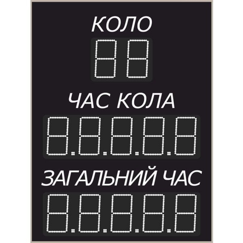 Табло служить для інформування спортсмена, тренера і глядачів про результати спортсмена при проходженні кругової дистанції. Дозволяє спортсменові розподіляти зусилля в міру проходження дистанції. Табло відмінно підходить для проведення індивідуальних тренувань з бігу на стадіоні, шорт-треку та інших циклічних видів спорту. Є можливість підключення фінішного створу, що дозволяє автоматизувати процес підрахунку кіл, або кнопки судді. Дозволяє спортсменові зосередитися на процесі бігу і контролювати свої проміжні результати. Комплект поставки: електронний лічильник кола-час; ІЧ пульт; паспорт і інструкція користувача; картонна упаковка. Висота всіх цифр: 150 мм, дальність видимості до 60 метрів. Максимальна кількість кіл: 99. Кількість цифр в кожному полі ЧАС: 5. Елемент індикації: світлодіод 5 мм. Яскравість світлодіодів: 3,5 Кд. Кут половинної яскравості світлодіодів: 60°. Дальність дії пульта, до: 8 метрів. Матеріал рами: алюміній. Матеріал корпусу: анодований алюміній. Лицьова панель: оргскло із захисною плівкою. Температура експлуатації: від -30 до +60°С. Напруга живлення: 220 В. Потужність: до 40 Вт. Тип кріплення табло: настінне/на стійку-підставку. Габарити табло в упаковці: 760х1060х70 мм.