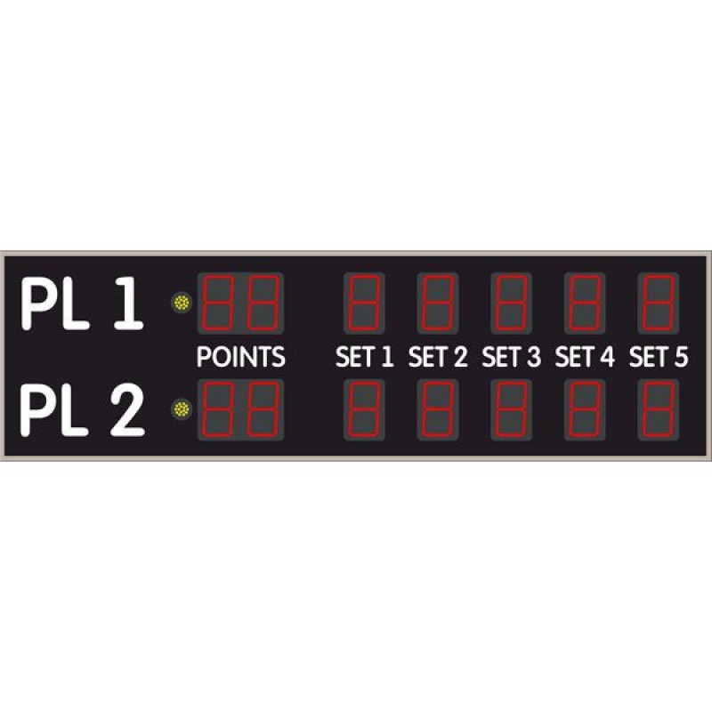 Табло для тенісу дозволяє стежити за результатами гри спортсменів. Просте і економічне в роботі може працювати як від дротяного пульта, так і управлятися зі смартфона або планшета по бездротовiй мережі Wi-Fi. Базова модель табло має настінне кріплення, але, на вимогу, можлива установка на мобільну підставку для транспортування табло на корт і установки в зручному для огляду місці. Програма управління, встановлена на планшеті, що входить в комплект поставки, записує в пам'ять все ігрові події в хронологічному порядку. Жорстка силова рама і облицювання з анодованого алюмінію дозволяють експлуатувати табло поза приміщеннями, при різних погодних умовах. Комплект поставки: спортивне табло; радіопульт-планшет; паспорт та інструкція з експлуатації; захисна упаковка. Висота всіх символів: 150 мм, дальність видимості до 60 метрів. Елемент індикації: світлодіод 5 мм. Яскравість світіння світлодіодів (залежить від кольору): 0,9-3,5 Кд. Кількість сетів: 5. Значення рахунку в партії: 0-15-30-40-А. Покажчик подачі: 2 (точковий індикатор). Матеріал рами: сталь. Матеріал корпусу: анодований алюміній. Лицьова панель: оргскло із захисною плівкою. Температура експлуатації: від -40 до +60°С. Напруга живлення: 220 В. Потужність: до 120 Вт. Тип кріплення табло: настінне. Дальність роботи оператора від табло: до 50 метрів. Габарити табло в упаковці: 2050х630х70 мм.