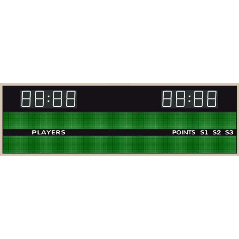 Табло для тенісних матчів може управлятися з дротяного пульта, комп'ютера, планшета або смартфона. Особливістю даної моделі є наявність полів часу з початку партії і астрономічного часу. Знаки на основному інформаційному полі виконані в спокійній колірній гамі. Висока щільність пікселів на інформаційному табло дозволяє виводити символи з високою якістю. На поле астрономічного часу можна поперемінно виводити значення температури повітря на корті. Точність ходу годинника астрономічного часу на табло є високою, але підключивши додатковий модуль з GPS приймачем, можна впевнено покластися на точність ходу, синхронізовану зі супутників. Програма управління дозволяє заздалегідь вводити пари тенісистів і записувати хронометраж гри. Для полів з кількома ігровими майданчиками, є можливість виведення інформації про ігри на всіх кортах на групове інформаційне табло або відповідний відеоекран. Комплект поставки: спортивне табло; планшет з програмою для тенісу; паспорт та інструкція з експлуатації; захисна упаковка. Висота всіх знакових символів: 150 мм, дальність видимості до 60 метрів. Елемент індикації: світлодіод 5 мм. Яскравість світіння світлодіодів (залежить від кольору): 0,9-3,5 Кд. Кількість сетів: 3. Значення рахунку в партії: 0-15-30-40-А. Покажчик подачі: 2. Розширення кожногоінформаційного рядка: 16х224 пікселів. Розмір шрифтів: вузький/широкий. Кількість знаків в полi ПРІЗВИЩЕ: 12/9. Тип шрифтів: кирилиця/латинський. Тривалість ходу годинника без живлення: до 15 днів. Матеріал рами: сталь. Матеріал корпусу: анодований алюміній. Лицьова панель: оргскло із захисною плівкою. Температура експлуатації: від -40 до +60°С. Напруга живлення: 220 В. Потужність в робочому режимі: до 400 Вт. Енергоспоживання в режимі годин: до 25 Вт. Тип кріплення табло: настінне. Дальність роботи оператора від табло: до 50 метрів. Габарити табло в упаковці: 2400х730х140 мм.
