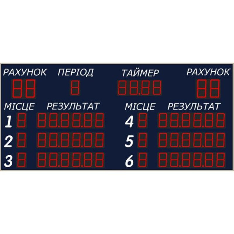 Передбачено підключення зовнішніх табло часу атаки для водного поло. Змагання з плавання можуть проводитися з тренерського пульта, або під управлінням комп'ютерної програми, і набору фінішних пультів для суддів на доріжках. В сумі, покупка цієї моделі табло дозволяє заощадити, в порівнянні з придбанням декількох вузькоспеціалізованих табло для басейну. Великі цифри дозволяють бачити результати запливів і зайняте плавцями місце навіть з віддалених місць на трибунах. А цифри рахунку при проведенні змагань з водного поло видно з відстані до 80 метрів. На вимогу встановлюється модуль сполучення з комп'ютером, і тоді з'являється можливість підготовки списків учасників запливів і підготовка протоколів змагань в форматі електронних таблиць. Ця опція потрібна при проведенні масових змагань. На вимогу можлива установка двох звукових сигналів високої потужності. Можлива установка зверху табло додаткового модуля для індикації температури води, повітря та астрономічного часу. Цей модуль має незалежне живлення, і може працювати при вимкненому табло, коли немає змагань і тренувань. Комплект поставки: спортивне табло для басейну комбіноване; пульт стартовий; пульт судді фінішний (6 шт); пульт установки годин інфрачервоний; комутатор - пульт на 6 доріжок; кабель комутатор-табло; сигнал звуковий для старту; пульт табло для водного поло; кабель для підключення пульта для водного поло; кабель підключення комп'ютера; перехідник для комп'ютера; програма проведення змагань з плавання на носії; паспорт та інструкція з експлуатації; захисна упаковка. Висота цифрових символів (місце, результат, період і таймер): 150 мм, дальність видимості до 60 метрів. Висота цифрових символів (рахунок): 200 мм, дальність видимості до 80 метрів. Елемент індикації: світлодіод 5 мм. Яскравість світіння світлодіодів: 1,5 Кд. Максимальна тривалість запливу: 59 хв 59 сек 99 соті. Час періоду і перерви: до 59 хв 59 сек. Матеріал рами: сталь. Матеріал корпусу: анодований алюміній. Температура експлуатації: від 0 до +60°С. Напруга живлення: 220 В. Потужність в режимі запливу: до 250 Вт. Тип кріплення: настінний. Габарити табло в упаковці: 2700х1250х140 мм.