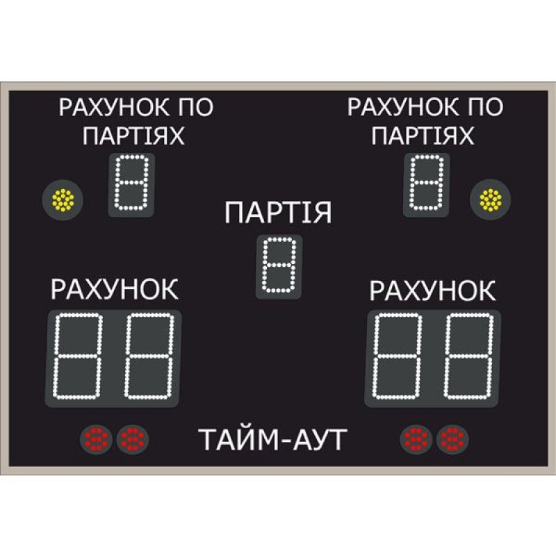 Табло володіє поліпшеними характеристиками, стосовно розміру цифр рахунку гри в поточній волейбольнiї партії. Спеціалізація табло на гру в волейбол включає алгоритм роботи відповідно до правил волейболу. Управління по радіоканалу дозволяє судді, тренеру або оператору вільно переміщатися, або розташуватися в зручному для нього місці, не втрачаючи контролю над інформацією на табло. Регулювання яскравості світіння дозволяє налаштувати комфортне сприйняття при будь-якому освітленні. Навчитися управлінню табло можна за лічені хвилини, додаткова підготовка не потрібна. Комплект поставки: табло для волейболу; радіопульт; сигнал звукової; паспорт та інструкція з експлуатації; захисна упаковка. Висота цифрових символів РАХУНОК: 150 мм, дальність видимості до 60 метрів. Висота цифр в полях ПАРТІЯ, РАХУНОК ПО ПАРТІЯХ: 100 мм, дальність видимості до 40 метрів. Елемент індикації: світлодіод 5 мм. Яскравість світіння світлодіодів (залежить від кольору): 0,8-1,5 Кд. Кількість градацій яскравості: 8. Матеріал рами: сталь. Матеріал корпусу: анодований алюміній. Лицьова панель: оргскло із захисною плівкою. Температура експлуатації: від -30 до +60°С. Напруга живлення: 220 В. Потужність в робочому режимі: до 40 Вт. Енергоспоживання в режимі годинника: до 20 Вт. Тип кріплення табло: настінне. Дальність роботи радіопульта: до 50 метрів. Габарити табло в упаковці: 1090х750х75 мм.