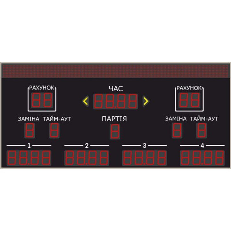 Табло має розширені можливості по виведенню інформації в волейбольнiй зустрічі. На додаток до основних, відображаються результати в кожній партії і кількість проведених замін. Може управлятися з планшетного комп'ютера, пульта або ноутбука, без проводів або по дроту. При заряджених акумуляторах, в додатковому живленні для керуючих пристроїв немає необхідності. Представлена можливість відображення всіх основних параметрів і ігрових ситуацій при грі в волейбол: рахунок в партії; відлік часу з початку гри, астрономічний час, час тайм-ауту; рахунок по партіях; номер поточної партії; кількість використаних тайм-аутів; стрілки-покажчики напрямку подачі м'яча; назви граючих команд, текстова інформація; звуковий сигнал: ручний і автоматичний режим роботи. Вдалий вибір для спеціалізованих волейбольних майданчиків. Табло розраховане на багаторічну безвідмовну роботу при високому навантаженні. Якщо в даний момент iгри не проводяться, табло можна використовувати в режимі годинника астрономічного часу. Комплект поставки: табло для волейболу електронне; радіопульт-планшет; сигнал звуковий; паспорт та інструкція з експлуатації; захисна упаковка. Висота всіх цифрових символів: 150 мм, дальність видимості до 60 метрів. Елемент індикації: світлодіод 5 мм. Яскравість світіння світлодіодів (залежить від кольору): 0,8-1,5 Кд. Кількість градацій яскравості: 8. Висота знаків назв команд: 130 мм. Розширення інформаційного рядка: 8х160 пікселів. Розмір шрифтів: вузький/широкий. Тип шрифтів: кирилиця/латинський. Кількість знаків на інформаційному рядку: 26 шт вузьким шрифтом, 20 шт широким шрифтом. Тривалість ходу годинника без живлення: до 15 днів. Збереження ігрових налаштувань: необмежено. Матеріал рами: сталь. Матеріал корпусу: анодований алюміній. Лицьова панель: оргскло із захисною плівкою. Температура експлуатації: від -20 до +60°С. Напруга живлення: 220 В. Потужність в робочому режимі: до 280 Вт. Енергоспоживання в режимі годинника: до 35 Вт. Тип кріплення табло: настінне. Дальність роботи планшета в бездротовому режимі: до 50 метрів. Габарити табло в упаковці: 2700х1250х140 мм.