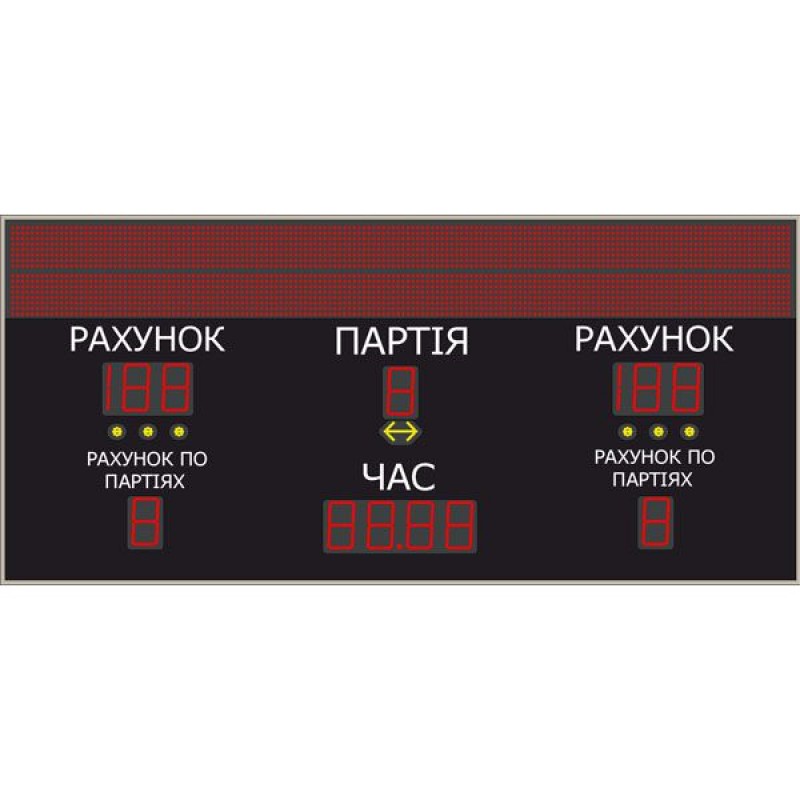 Спортивне електронне табло для змагань з пляжного волейболу управляється з комп'ютера або ноутбука з ОС Windows. Дозволяє виводити на табло прізвища пар волейболістів, які беруть участь в поточній грі. Можливості виведення ігрової інформації на табло для пляжного волейболу: поточний рахунок в партії; рахунок по партіях; номер поточної партії; кількість перерв; стрілка напрямку подачі; прізвища двох волейболістів, які беруть участь в грі, для кожної команди; звукова сирена; час гри або індикація астрономічного часу, коли немає ігор. Управління табло можливо по дроту, або по мережі Wi-Fi - бездротовим чином. Спеціальна програма дозволяє проводити ігри на більш високому рівні організації змагального процесу. У налаштуваннях програми можна вибрати різні теми в оформленні зовнішнього вигляду програми. Комплект поставки: табло для волейболу; конвертер USB; кабель з'єднувальний; сигнал звуковий; паспорт та інструкція з експлуатації; програма на носії; захисна упаковка. Висота всіх цифрових символів: 150 мм, дальність видимості до 60 метрів. Стрілки індикації команди, що подає: 2. Елемент індикації: світлодіод 5 мм. Яскравість світіння світлодіодів (залежить від кольору): 0,8-1,5 Кд. Кількість градацій яскравості: 8. Висота знаків назв команд: 130 мм. Розширення інформаційного рядка: 8х160 пікселів. Розмір шрифтів: вузький/широкий. Тип шрифтів: кирилиця/латинський. Кількість знаків на інформаційному рядку: 26 шт вузьким шрифтом, 20 шт широким шрифтом. Максимальна тривалість періоду: 59 хвилин. Максимальна тривалість перерви: 59 хвилин. Тривалість ходу годинника без живлення: до 15 днів. Збереження ігрових налаштувань: необмежено. Матеріал рами: сталь. Матеріал корпусу: анодований алюміній. Лицьова панель: оргскло із захисною плівкою. Температура експлуатації: від -30 до +60°С. Напруга живлення: 220 В. Потужність в робочому режимі: до 200 Вт. Енергоспоживання в режимі годинника: до 35 Вт. Тип кріплення табло: настінне. Габарити табло в упаковці: 2700х1250х140 мм.