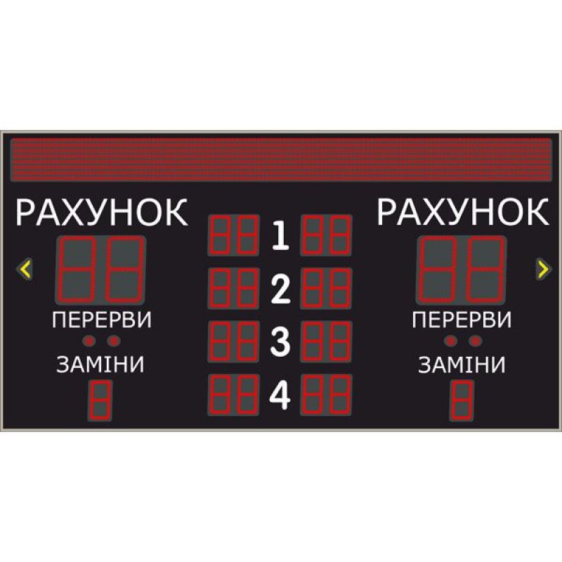 На цій моделі табло крупно виводяться назви команд або текстова інформація, рахунок в поточній партії, результати в кожній зігранiй партії. Це дозволяє глядачам і спортсменам сприймати ігрову інформацію на відстані до 60 метрів в комфортному режимі, а не вдивлятися в значення знаків на табло. Табло прекрасно підійде для залів, де проходять змагання з волейболу з середньою кількістю глядачів. Комп'ютерна програма для волейболу успішно працює на ноутбуках з ОС Windows, так і на планшетах з ОС Android. Управління табло для волейболу, ведення статистики гри, з можливістю роздруківки, введення даних про гравців, вибір теми оформлення для додання кращого зовнішнього вигляду програми - це не всі можливості програмного забезпечення. Підключайтеся до табло як вам зручно: по дроту або через мережу Wi-Fi. Є можливість управління табло з проводового пульта, без комп'ютерів. Комплект поставки: табло для волейболу електронне; радіопульт-планшет; сирена; паспорт та інструкція з експлуатації; захисна упаковка. Висота цифрових символів поля РАХУНОК: 350 мм, дальність видимості до 120 метрів. Висота цифр в полях РАХУНОК ПО ПАРТІЯХ, ЗАМІНИ: 210 мм, дальність видимості до 80 метрів. Напрямки стрілки команди, що подає: 2. Елемент індикації: світлодіод 5 мм. Яскравість світіння світлодіодів (залежить від кольору): 0,9-1,2 Кд. Кількість градацій яскравості: 8. Висота знаків назв команд: 200 мм. Розширення інформаційного рядка: 8х128 пікселів. Кількість світлодіодів в пікселі: 4 шт. Розмір шрифтів: вузький/широкий. Тип шрифтів: кирилиця/латинський. Кількість знаків на інформаційному рядку: 21 шт вузьким шрифтом, 16 шт широким шрифтом. Тривалість ходу годинника без живлення: до 15 днів. Збереження ігрових налаштувань: необмежено. Матеріал рами: сталь. Матеріал корпусу: анодований алюміній. Лицьова панель: оргскло із захисною плівкою. Температура експлуатації: від -30 до +60°С. Напруга живлення: 220 В. Потужність в робочому режимі: до 250 Вт. Енергоспоживання в режимі годинника: до 45 Вт. Тип кріплення табло: настінне. Дальність роботи планшета: до 50 метрів. Габарити табло в упаковці: 3000х1650х140 мм.