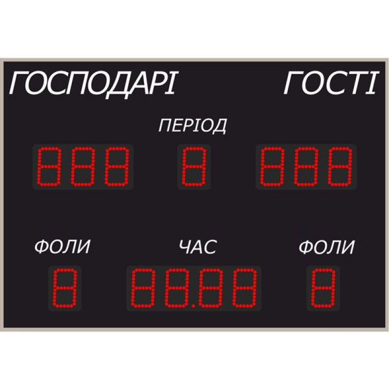 Табло підходить для багатьох ігрових видів спорту в залі: баскетболу, волейболу, гандболу, міні-футболу та інших. На цифрах в нижньому рядi можуть виводитися командні фоли або рахунок за партіями. На табло передбачено підключення управління від дротового пульта (купується окремо). При цьому управління по радіоканалу автоматично і включається при відключенні дротового пульта. Звуковий сигнал кріпиться поруч з табло і направляється в центр ігрового майданчика. Досвід експлуатації табло цієї серії підтверджує високу надійність роботи табло, але для захисту від ударів м'ячем рекомендується встановлювати перед табло сітку. Така сітка здатна зупинити м'яч, що летить з високою швидкістю. Можливості виведення спортивної ігрової інформації: час гри (прямий і зворотний відлік); рахунок (0-199); період (0-Е); командні фоли або рахунок по партіях (0-9); звукова сирена з можливістю подачі сигналу вручну; режим годин астрономічного часу, коли немає ігор. Комплект поставки: табло; радіопульт; звуковий сигнал; паспорт і інструкція користувача; захисна упаковка. Висота цифрових символів: 100, дальність видимості до 40 метрів. Елемент індикації: світлодіод 5 мм. Яскравість світіння світлодіодів (залежить від кольору): 0,4-3,5 Кд. Кількість градацій яскравості: 8. Максимально можлива тривалість періоду: до 59 хв. Максимальна тривалість перерви: до 59 хв. Збереження ігрових налаштувань: необмежено. Тривалість ходу годинника без живлення: до 15 днів. Матеріал рами: сталь. Матеріал корпусу: анодований алюміній. Лицьова панель: оргскло із захисною плівкою. Температура експлуатації: від -40 до +60°С. Можливість роботи на вулиці. Напруга живлення: 220 В. Потужність в ігровому режимі: до 40 Вт. Енергоспоживання в режимі годинника: до 20 Вт. Тип кріплення: настінний. Дальність роботи радіопульта: до 70 метрів. Габарити табло в упаковці: 1090х750х75 мм.