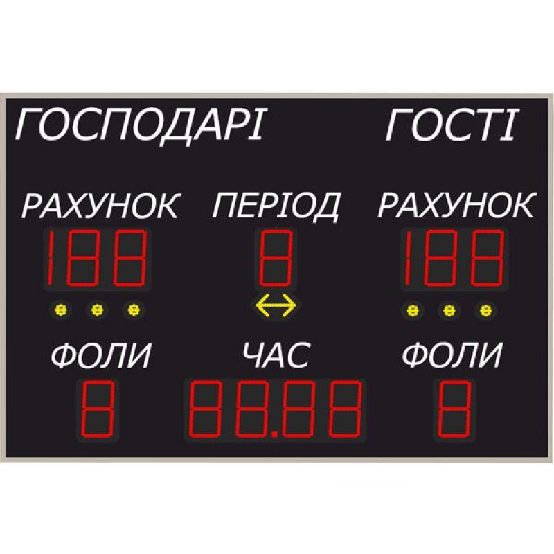 Дуже популярна модель для використання в спортивних залах невеликого і середнього розміру. Стрілка на табло показує напрямок подачі у волейболі або володіння м'ячем в баскетболі. Управління з компактного радіопульта, який легко поміщається в руці, дозволяє тренеру поєднувати суддівство на ігровому майданчику та функції оператора спортивного табло. Табло має вбудований годинник астрономічного часу, які зберігає хід протягом двох тижнів без підключення до мережі живлення. Це дозволяє економити час на встановлення та налаштування годин при короткочасному зникненню напруги. Без батарейок, без додаткового обслуговування. Єдиний протокол зв'язку дозволяє використовувати цю модель в якості дублюючого табло. Комплект поставки: табло; радіопульт; звуковий сигнал; паспорт і інструкція користувача; захисна упаковка. Висота цифрових символів: 150 мм, дальність видимості до 60 метрів. Елемент індикації: світлодіод 5 мм. Яскравість світіння світлодіодів (залежить від кольору): 0,4-3,5 Кд. Кількість градацій яскравості: 8. Максимально можлива тривалість періоду: до 59 хв. Максимальна тривалість перерви: до 59 хв. Збереження ігрових налаштувань: необмежено. Тривалість ходу годинника без живлення: до 15 днів. Матеріал рами: сталь. Матеріал корпусу: анодований алюміній. Лицьова панель: оргскло із захисною плівкою. Температура експлуатації: від -30 до +60°С. Можливість роботи на вулиці. Напруга живлення: 220 В. Потужність в ігровому режимі: до 55 Вт. Енергоспоживання в режимі годинника: до 25 Вт. Тип кріплення: настінне. Дальність роботи радіопульта: до 50 метрів. Габарити табло в упаковці: 1600х1050х75 мм.