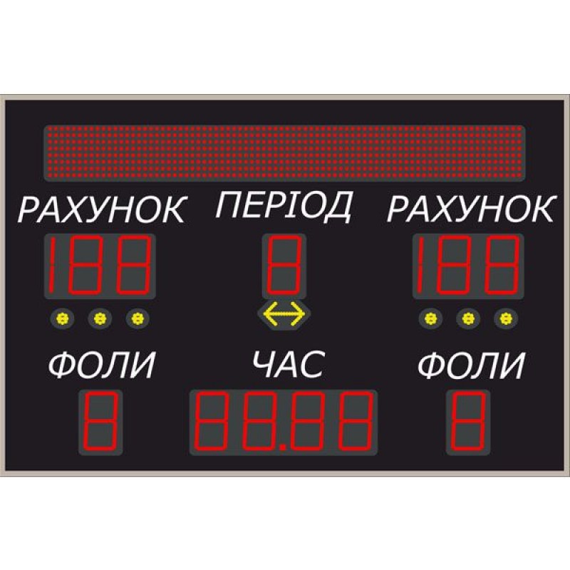 Табло для виведення основних ігрових параметрів, назв команд і текстової інформації в режимі "рухомого рядка". Управління з планшета, що входить в комплект поставки, максимально просте і інтуїтивно зрозуміле. Навчання управлінню універсальним табло займає лічені хвилини. Можливості виведення на універсальному табло: час гри (прямий і зворотний відлік); рахунок (0-199); період (0-9, є екстратайм); фоли для кожної команди; інформаційна рядок; покажчик володіння м'ячем або напрямку подачі; тайм-аути для кожної команди; програмована звукова сирена з можливістю ручного подавання сигналу; режим годин астрономічного часу, поки немає спортивних ігор. Як виглядає програма для проведення змагань з волейболу на смартфоні, показано на фото. На сьогоднішній день програма підтримує проведення ігор з найпопулярніших видів спорту в залі: баскетбол, волейбол, гандбол, мініфутбол і іншим. Електронний годинник на табло має високу точність ходу і показує астрономічний час при відсутності спортивних ігор. Установка часу на годиннику також проводиться з планшета. При зникненні напруги в мережі хід годинника зберігається протягом двох тижнів. Табло не вимагає додаткового обслуговування, такого як заміна батарейок, дуже економічне, просте і надійне в експлуатації. Комплект поставки: табло; радіопульт-планшет; звуковий сигнал; паспорт і інструкція користувача; захисна упаковка. Висота цифрових символів: 150 мм, дальність видимості до 60 метрів. Елемент індикації: світлодіод 5 мм. Яскравість світіння світлодіодів (залежить від кольору): 0,4-3,5 Кд. Кількість градацій яскравості: 8. Висота знаків назв команд: 130 мм. Розширення інформаційного рядка: 8х112 пікселів. Розмір шрифтів: вузький/широкий. Тип шрифтів: кирилиця/латинський. Кількість знаків на інформаційному рядку: 14 шт. вузьким шрифтом, 18 шт. широким шрифтом. Максимально можлива тривалість періоду: до 59 хв. Максимальна тривалість перерви: до 59 хв. Збереження ігрових налаштувань: необмежено. Тривалість ходу годинника без живлення: до 15 днів. Матеріал рами: сталь. Матеріал корпусу: анодований алюміній. Лицьова панель: оргскло із захисною плівкою. Температура експлуатації: від -40 до +60°С. Можливість роботи на вулиці. Напруга живлення: 220 В. Потужність в ігровому режимі: до 85 Вт. Енергоспоживання в режимі годинника: до 25 Вт. Тип кріплення: настінний. Дальність роботи планшета: до 50 метрів. Габарити табло в упаковці: 1600х1050х75 мм.
