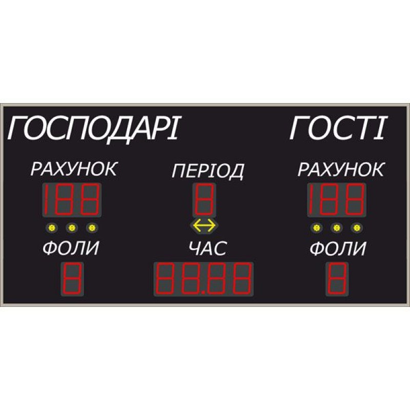 Табло універсальне підходить для будь-якого ігрового залу. Дозволяє проводити змагання з баскетболу, волейболу, міні футболу, гандболу та інших командних ігор. Має можливість виведення основних ігрових параметрів з простого в освоєнні радіопульта з дальністю роботи до 70 метрів. Не вимагає направляти пульт в сторону табло, вміщується в кишені. Можливості виведення інформації на спортивному універсальному табло: час гри (прямий і зворотний відлік), час перерви між таймами; рахунок в грі (0-199); період, включаючи екстра-тайм для баскетболу; командні фоли; покажчик володіння м'ячем; тайм-аути (перерви) для кожної команди; звукова сирена двотональна; годинник астрономічного часу, коли спортивні ігри закінчені. Комплект поставки: табло; радіопульт; звуковий сигнал; паспорт і інструкція користувача; захисна упаковка. Висота цифрових символів: 150 мм, дальність видимості до 60 метрів. Елемент індикації: світлодіод 5 мм. Яскравість світіння світлодіодів (залежить від кольору): 0,4-3,5 Кд. Кількість градацій яскравості: 8. Максимально можлива тривалість періоду: до 59 хв. Максимальна тривалість перерви: до 59 хв. Збереження ігрових налаштувань: необмежено. Тривалість ходу годинника без живлення: до 15 днів. Матеріал рами: сталь. Матеріал корпусу: анодований алюміній. Лицьова панель: оргскло із захисною плівкою. Температура експлуатації: від -40 до +60°С. Можливість роботи на вулиці. Напруга живлення: 220 В. Потужність в ігровому режимі: до 85 Вт. Енергоспоживання в режимі годинника: до 25 Вт. Тип кріплення: настінний. Дальність роботи пульта: до 50 метрів. Габарити табло в упаковці: 2100х1050х75 мм.