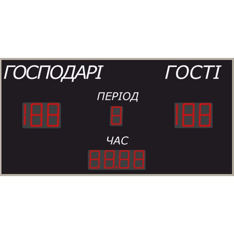Спрощений варіант універсального табло дозволяє проводити ігри в залах або відкритих спортивних майданчиках середнього розміру. Управління з радіопульта в базовій поставці дозволяє управляти табло без необхідності обладнання спеціального місця. На табло передбачена можливість підключення проводового пульта з OLED індикатором. Можливості виведення ігрової інформації: час гри (прямий і зворотний відлік); рахунок (0-199); період (0-9); програмована звукова сирена з можливістю ручного подавання сигналу; режим годинника астрономічного часу. Комплект поставки: табло; радіопульт; звуковий сигнал; паспорт і інструкція користувача; захисна упаковка. Висота цифрових символів (рахунок): 210 мм, дальність видимості до 80 метрів. Висота інших цифрових символів: 150 мм, дальність видимості до 60 метрів. Елемент індикації: світлодіод 5 мм. Яскравість світіння світлодіодів (залежить від кольору): 0,4-3,5 Кд. Кількість градацій яскравості: 8. Максимально можлива тривалість періоду: до 59 хв. Максимальна тривалість перерви: до 59 хв. Збереження ігрових налаштувань: необмежено. Тривалість ходу годинника без живлення: до 15 днів. Матеріал рами: сталь. Матеріал корпусу: анодований алюміній. Лицьова панель: оргскло із захисною плівкою. Температура експлуатації: від -30 до +60°С. Можливість роботи на вулиці. Напруга живлення: 220 В. Потужність в ігровому режимі: до 85 Вт. Енергоспоживання в режимі годинника: до 25 Вт. Тип кріплення: настінний. Дальність роботи пульта: до 50 метрів. Габарити табло в упаковці: 2100х1050х75 мм.
