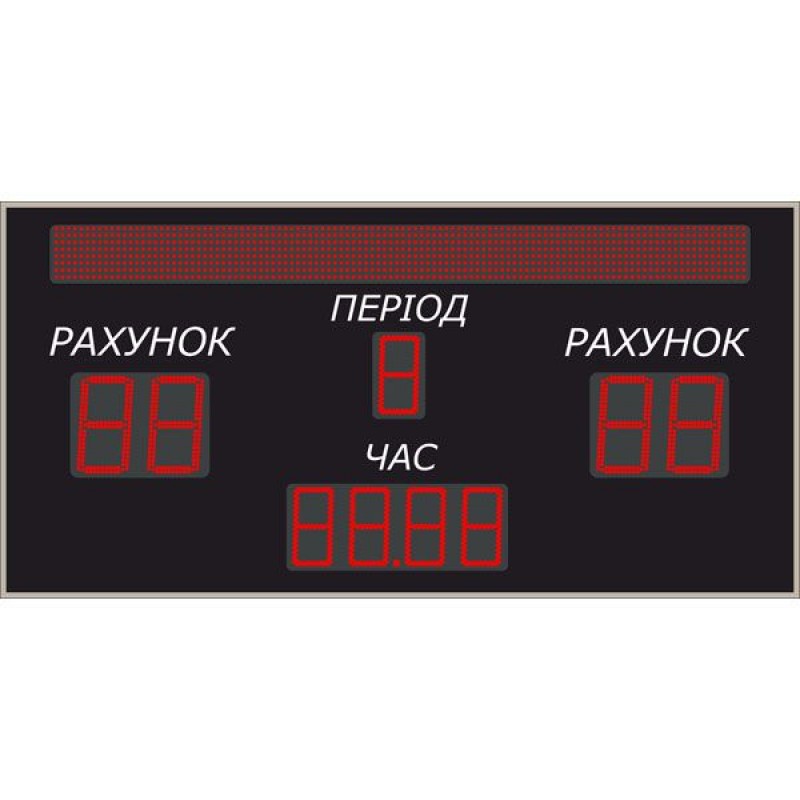 Табло цієї моделі відрізняється великою відстанню, на якiй видно цифри рахунку. Управління таким табло можна освоїти за кілька хвилин без особливих проблем. Інтуїтивно зрозуміла програма дозволяє проводити гру без напруги. Планшет має невелику вагу і зручний в обігу: просте підключення по мережі Wi-Fi. Табло відмінно підійде для залів, де популярні ігри в міні-футбол, гандбол та інші. Крім назв команд, на інформаційному рядку можуть автоматично виводитися короткі текстові повідомлення про ігрові події. Програма автоматично веде протокол гри з можливістю аналізу ігрових подій при спірних ситуаціях з прив'язкою до ігрового і астрономічному часу. Ігрова інформація, що відображається на універсальному табло: час гри (прямий і зворотний відлік), час перерв і тайм-аутів; актуальний рахунок в грі (0-99); період (0-9, екстратайм); інформаційний рядок з широким функціоналом; програмована звукова сирена з можливістю ручного подавання сигналу; режим годин астрономічного часу, поки немає ігор і тренувань. Комплект поставки: табло; радіопульт-планшет; сирена; паспорт і інструкція користувача. Висота цифрових символів (рахунок): 250 мм, дальність видимості до 100 метрів. Висота цифрових символів (час, період): 210 мм, дальність видимості до 80 метрів. Елемент індикації: світлодіод 5 мм. Яскравість світіння світлодіодів (залежить від кольору): 0,4-3,5 Кд. Кількість градацій яскравості: 8. Висота знаків назв команд: 130 мм. Розширення інформаційного рядка: 8х112 пікселів. Розмір шрифтів: вузький/широкий. Тип шрифтів: кирилиця/латинський. Кількість знаків на інформаційному рядку: 14 шт. вузьким шрифтом, 18 шт. широким шрифтом. Максимально можлива тривалість періоду: до 59 хв. Максимальна тривалість перерви: до 59 хв. Збереження ігрових налаштувань: необмежено. Тривалість ходу годинника без живлення: до 15 днів. Матеріал рами: сталь. Матеріал корпусу: анодований алюміній. Лицьова панель: оргскло із захисною плівкою. Температура експлуатації: від -40 до +60°С. Напруга живлення: 220 В. Потужність в ігровому режимі: до 105 Вт. Енергоспоживання в режимі годинника: до 35 Вт. Тип кріплення: настінний. Дальність роботи радіопульта-планшета: до 50 метрів. Габарити табло в упаковці: 2100х1050х75 мм.