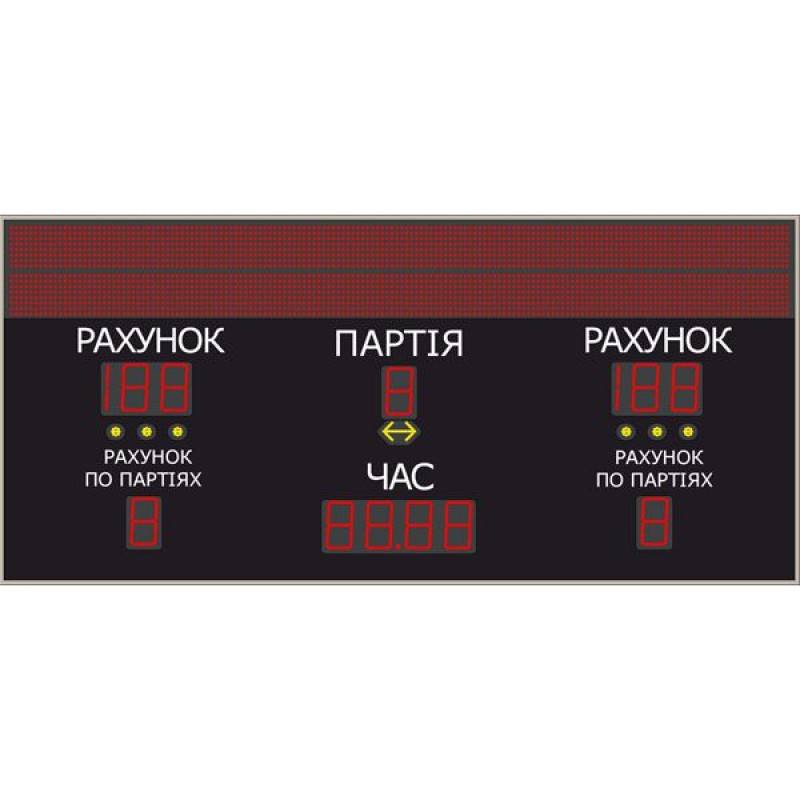 Табло має два інформаційних рядки для виведення текстової інформації. Верхній рядок може працювати в режимі "рухомого рядка", на нижній розміщується довільна статична інформація - наприклад назву міста або країни, звідки приїхала команда. На поле "Рахунок по партіях" можна виводити значення командних фолів при грі в баскетбол, міні-футбол або гандбол. Можливе виведення коротких повідомлень про ігрові подїї. Можливості виведення ігрової інформації на табло: поточний рахунок в грі; рахунок по партіях або командні фоли; номер поточної партії; кількість перерв; стрілка напрямку подачі або володіння м'ячем; дворядкове інформаційне поле для виведення назв команд, текстової інформації в режимі "рухомого рядка" (на верхньому полі); двотональний звуковий сигнал; час гри, перерви або тайм-ауту; індикація астрономічного часу на полі час, коли немає ігор. Управління табло можливо по дроту, від комп'ютера, або по мережі Wi-Fi - без проводів і без проблем. Комплект поставки: табло спортивне універсальне; планшет-пульт; сирена 20 Вт; паспорт і інструкція користувача; захисна упаковка. Висота всіх цифрових символів: 150 мм. Дальність видимості до: 60 метрів. Висота знаків інформаційного рядка: 130 мм. Розширення на інформаційному полі: 8х160. Кількість інформаційних рядків: 2. Кількість одночасно відображуваних символів, шт.: 20 широким, 26 вузьким шрифтом. Тип символів: кирилиця/латинський. Елемент індикації: світлодіод 5 мм. Яскравість світіння світлодіодів (залежить від кольору): 0,8-1,5 Кд. Кількість градацій яскравості: 8. Максимально можлива тривалість періоду: до 59 хв. Максимальна тривалість перерви: до 59 хв. Збереження ігрових налаштувань: необмежена. Тривалість ходу годинника без живлення: до 15 днів. Матеріал рами: сталь. Матеріал корпусу: анодований алюміній. Лицьова панель: оргскло із захисною плівкою. Температура експлуатації: від -30 до +60°С. Напруга живлення: 220 В. Потужність в ігровому режимі: до 200 Вт. Енергоспоживання в режимі годинника: до 35 Вт. Тип кріплення: настінний. Габарити табло в упаковці: 2700х1250х140 мм.