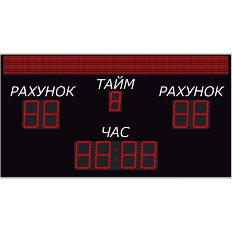 Табло універсальне дозволяє спостерігати за часом гри і рахунком в залах середнього розміру з видимістю до 120 метрів. Базова комплектація включає планшет з встановленим програмним забезпеченням, звуковий сигнал, паспорт з інструкцією і захисну упаковку. В поставку включені елементи для настінного кріплення спортивного табло. Анкерні болти та інші кріпильні елементи вибираються виходячи з особливостей матеріалу стіни і в комплект поставки не входять. Програма спортивного табло підтримує більше 15 основних ігрових видів спорту. Відмінністю цієї моделі є баланс великих цифр рахунку і великих знаків назв команд на інформаційному полі, для табло таких розмірів. На вимогу, табло може додатково оснащуватися приймачем супутникового сигналу для абсолютної точності ходу годинника. Універсальне спортивне табло, при грамотній установці, може безвідмовно пропрацювати протягом дуже тривалого часу. Інформація, яка може виводитися на універсальному табло: ігровий час (в прямому і зворотному напрямку), час перерви, час тайм-ауту; рахунок в грі (0-99); період (0-9, екстра-тайм Е); інформаційний рядок з декількома режимами відображення ігрової інформації; автоматичний звуковий сигнал з можливістю ручного подавання сигналу; режим годин астрономічного часу, з високою точністю ходу. Висота цифрових символів (рахунок, час): 350 мм. Висота цифрових символів (тайм): 250 мм. Висота знаків на інформаційному полі: 200 мм. Дальність видимості: до 120 метрів. Елемент індикації: світлодіод 5 мм. Яскравість світіння світлодіодів: 1 Кд. Кількість градацій яскравості: 8. Розширення інформаційного рядка: 8х128 пікселів. Розмір шрифтів: вузький/широкий. Тип шрифтів: кирилиця/латинський. Кількість знаків на інформаційному полі: 16/21. Кількість знаків в назві кожної команди: до 10. Максимально можлива тривалість тайму: до 59 хв (налаштовувана). Максимальна тривалість перерви: до 59 хв (налаштовувана). Тривалість ходу годинника без живлення: до 15 днів. Матеріал рами: сталь. Матеріал корпусу: анодований алюміній. Лицьова панель: оргскло із захисною плівкою. Температура експлуатації: від -30 до +60°С. Можливість роботи поза приміщенням. Напруга живлення: 220 В. Потужність в ігровому режимі: до 200 Вт. Енергоспоживання в режимі годинника: до 45 Вт. Тип кріплення, базовий: настінний. Дальність роботи планшета: до 50 метрів.
