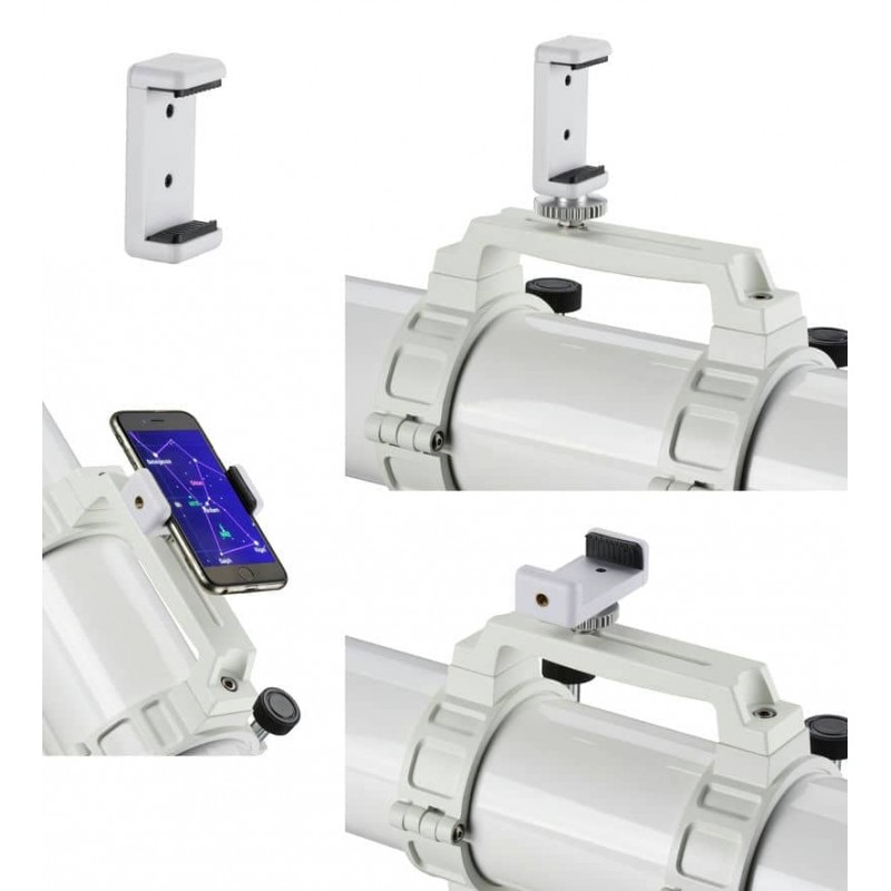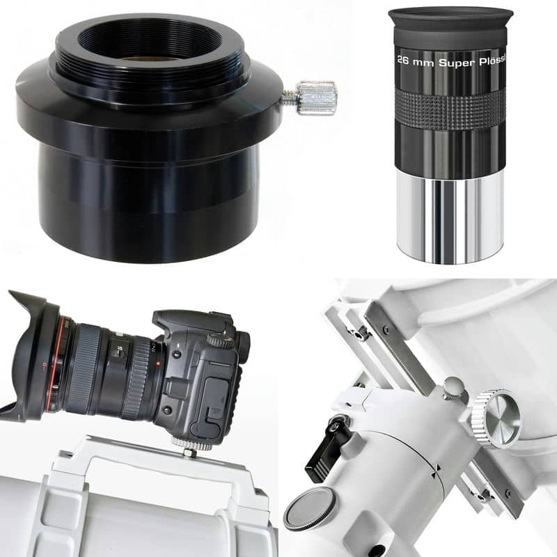 - Комплектація: Зорова труба телескопа; Німецьке екваторіальне монтування EXOS 1 з польовим штативом із труби з нержавіючої сталі; Противага 1 х 4,5 кг; Апертурний Сонячний фільтр; Окуляр: 26 мм SuperPloessl (Ø 31,7 мм/1,25'') з повним багатошаровим просвітленням; Діагональне дзеркало з діагоналлю 31,7 мм (1,25 дюйма); Інтегрований адаптер 31,7 мм і T2; Монтажне кільце (для EXOS та подібних кріплень); Рейка із затискною поверхнею з нержавіючої сталі (44 мм універсальний ластівчин хвіст для GP/EQ5/LXD75); Ручка з тримачем камери; Видошукач оптичний 6x30; Адаптер смартфона для астронавігації; Астрономічна програма для ПК Stellarium; Зоряна карта, що обертається.