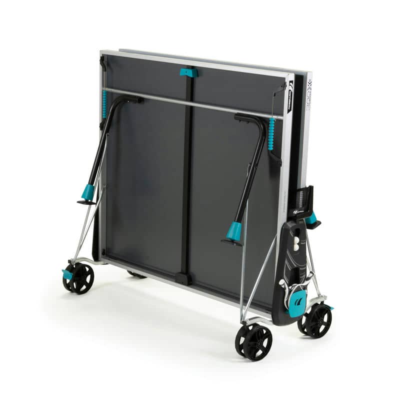 ВЕЛИКІ КОЛЕСА З ГАЛЬМУВАННЯМИ: Столи для пінг-понгу Cornilleau мають великі подвійні колеса товщиною 32 мм і діаметром 200 мм. Таке рішення збільшує кочення коліс і стійкість столу. Більше колесо легко перекочуватиме великі перешкоди, такі як сходи, пороги та каміння. Він легше долає густу траву та інші нерівності, а два гальма забезпечують відмінну стійкість і безпеку під час гри. Це також особливо корисно, коли стіл зберігається на трохи нерівній поверхні.
