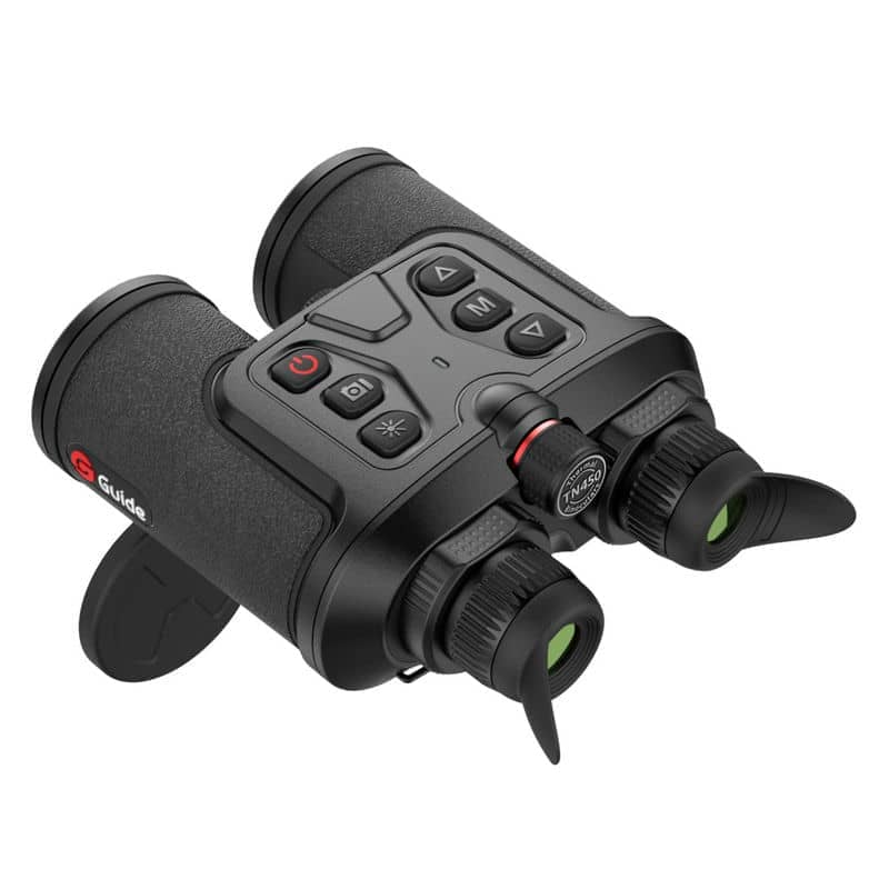Guide TN450 – це потужний тепловізійний бінокуляр з лазерним далекоміром та компасом для спостереження за найбільш віддаленими джерелами тепла. Безпрецедентна по своїй зручності бінокулярна конструкція з двома екранами дозволить безперервно стежити за ціллю упродовж тривалого часу, не втомлюючи при цьому очі. Модель вирізняється інфрачервоною оптикою зі звуженим полем зору з метою досягнення найвищих показників щодо дальності виявлення. Такий пристрій ідеально проявить себе у військових чи тактичних заходах, патрулюванні та охороні кордонів, рятувальних і пошукових операціях або під час нічного полювання. Відео- та фотофіксацію своїх спостережень можна зберігати на вбудованому накопичувачі ємністю 16 Гб.