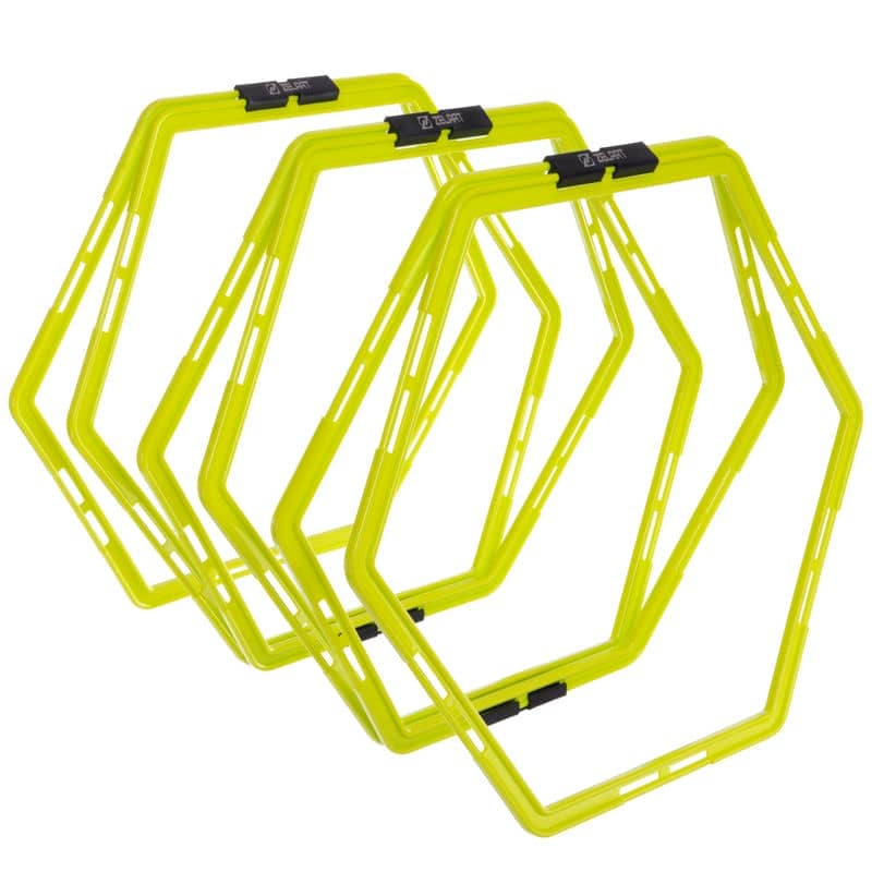 Швидкісна драбина від бренду Zelart складається з 6 гексагональних кілець, які з'єднуються між собою в єдину конструкцію за допомогою пластикових кріплень. Самі кільця виготовлені з поліпропілену і пофарбовані в салатовий колір для кращої видимості. Кільця мають високу міцність і стійкість до механічних пошкоджень: якщо в процесі тренування спортсмен випадково наступить на одне з них, конструкція не зламається. При цьому в разі падіння на кільця ймовірність отримання травми мінімальна. Після тренування кільця можна скласти до компактного розміру, помістивши їх одне на інше. Це дає змогу заощадити місце для зберігання та зручно транспортувати тренажер.