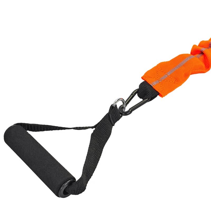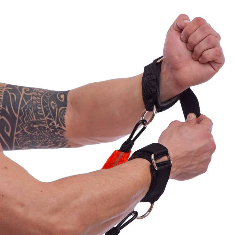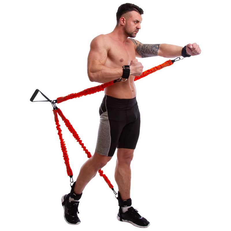 Така тренувальна система відноситься до пружинячих снарядів. Джгути - еластичні і міцні, з часом не деформуються. Вони «одягнені» в гофровані чохли, які захищають їх від механічних пошкоджень, шкідливих ультрафіолетових променів і перенапруг. Всі манжети м'які, широкі і міцні - вони не порвуться під час тренування і не перекриють кровотік. Кільця і карабіни виконані з металу. Тренувальна система застосовується як навчальний пристрій для боксерів і бійців MMA для підвищення потужності, швидкості ударів і вибухової сили. Також рекомендується для вправ з відпрацювання ривків, проходок в партер. Будь-які вправи з нею робити набагато складніше, тому що доводиться долати постійний опір джгутів. Підходить спортсменам з різною комплекцією - прекрасно витримує навіть істотну вагу. Для занять потрібен партнер або нерухома опора, щоб утримувати систему. Чотири незалежні джгута, що йдуть від манжет, з'єднуються карабінами на кільці рукояті, яка утримується партнером (надійно кріпиться за нерухомий предмет). Наручнi манжети зручно розташовуються навколо зап'ястя і фіксуються петлею за великий палець, поверх них можна надіти рукавички, якщо це необхідно. Ножні манжети фіксуються лямками за стопу. Матеріал: етиленвінілацетат (EVA), термопластична гума (TPR), метал. Довжина джгутів: 2x43 см, 2x47 см. Розмір виробу: регульований. Система фіксації: липучки. Колір: чорний, помаранчевий. Комплектація: еластичні джгути - 4 шт; манжети (для рук і ніг) - 4 шт; рукоять (якір) - 1 шт; сумка-мішок - 1 шт.