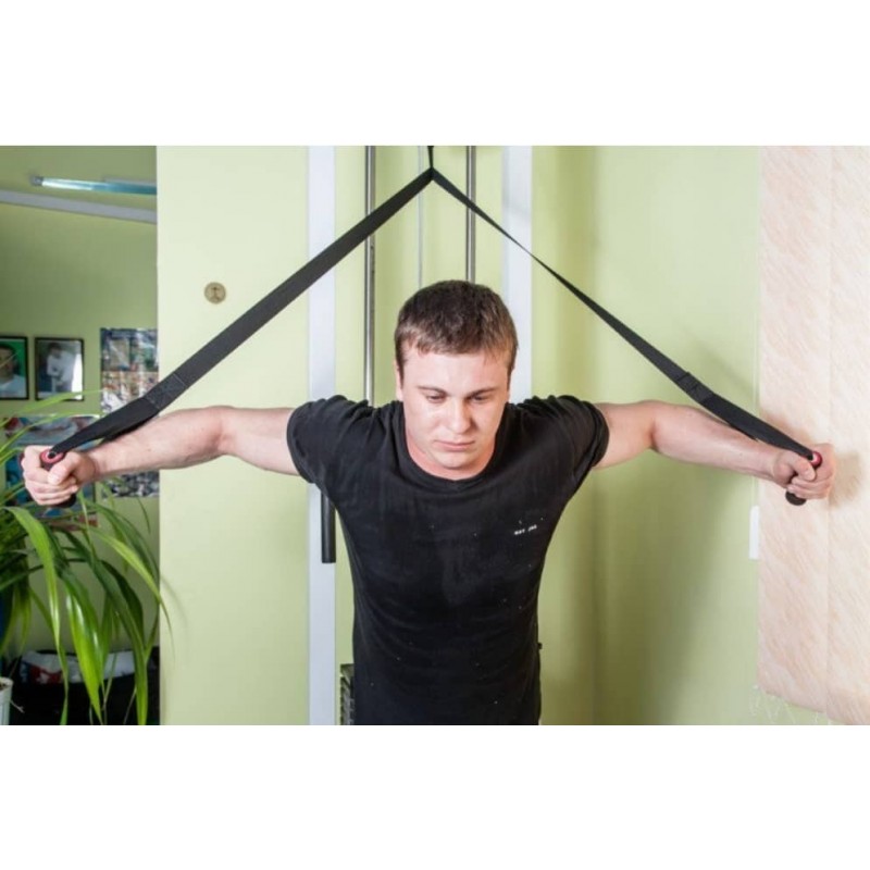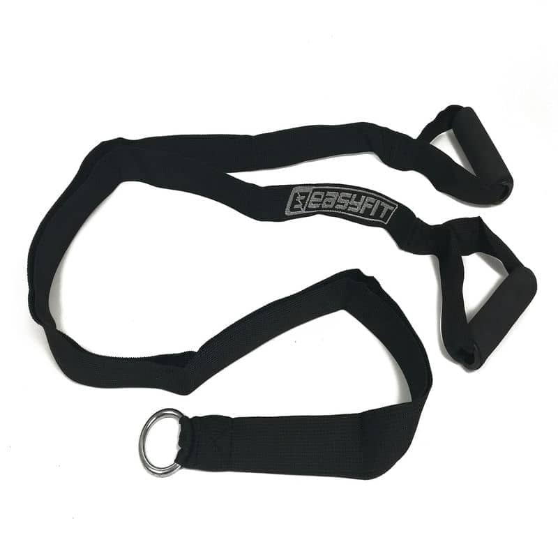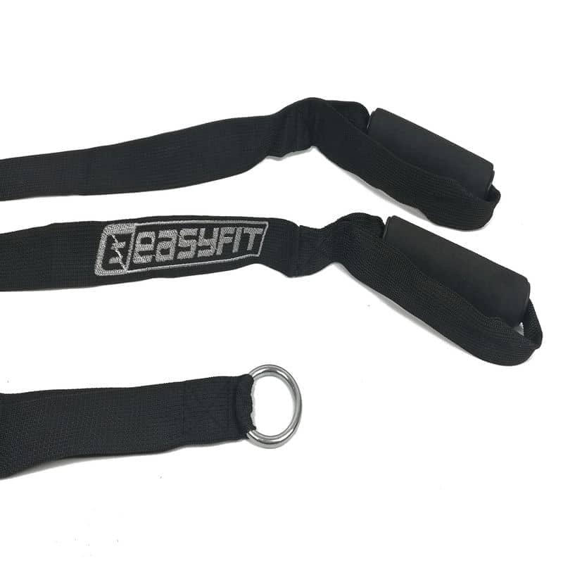 Ідеальний додаток для блочних тренажерів - тяга EasyFit R2 з двома зручними, але жорсткими ручками, повністю безпечна при інтенсивних тренуваннях. Встановлюється на тренажери, подібні до «кросовера», в будь-якій залі. Вона складається з кількох міцних ременів та жорстко закріплених стійких ручок, призначених для хвату при виконанні вправ. Зручні петлі досить просторі, вони комфортно фіксують руку спортсмена і забезпечує бажане зусилля. Міцна конструкція здатна витримати великі силові навантаження. Тяга укріплена по всьому периметру надійними строчками. Кріпиться система за допомогою сталевого кільця, виконане з високоміцної сталі.