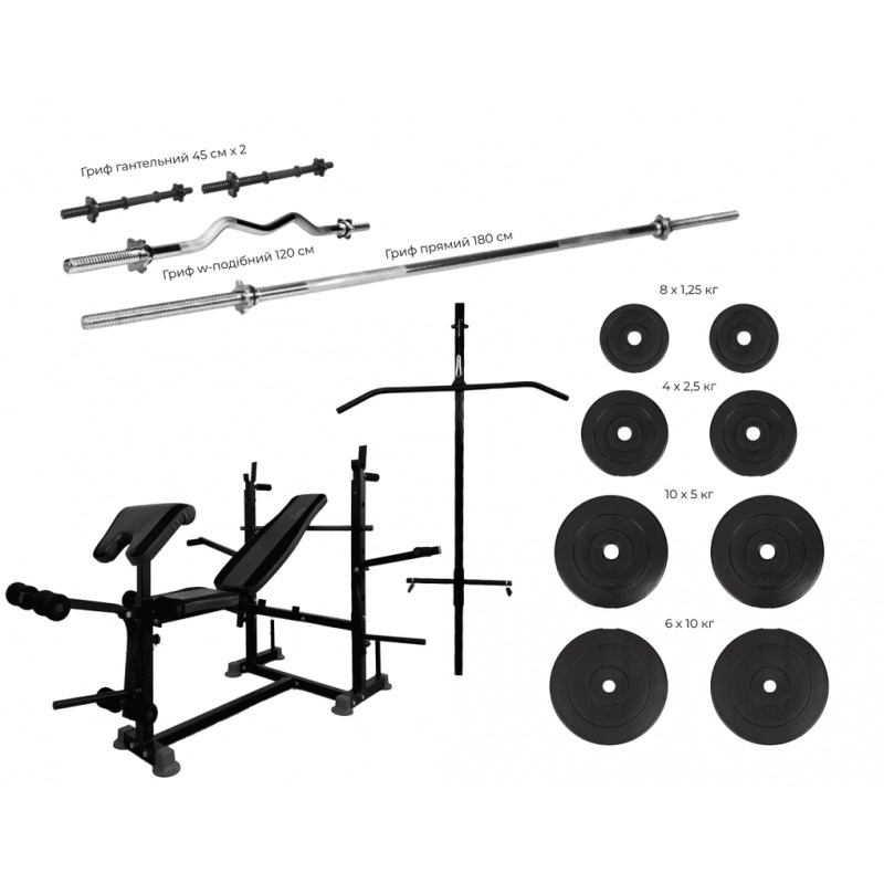 В комплектацію набору додатково входить набір штанга + гантелі 148 кг.