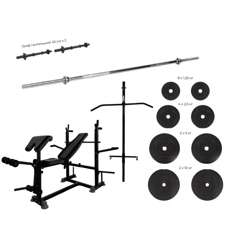 В комплектацію набору додатково входить набір штанга + гантелі 60 кг.