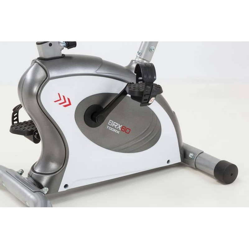 Велотренажер Toorx Upright Bike BRX 60 (BRX-60) від італійського виробника Garlando S.p.A. призначений для повноцінного кардіотренування в домашніх умовах. Тренажер має 8-рівневе ручне регулювання навантаження, а також простий у користуванні комп'ютер. 7-кілограмовий маховик створює достатню плавність ходу, знижуючи навантаження на суглоби та мінімізуючи ризик отримання травми в процесі занять. Велотренажер розрахований на вагу до 110 кг і підійде для користувачів зростом до 2 м. Вбудовані сенсорні датчики вимірювання пульсу будуть доречними під час тренування для контролю частоти серцевих скорочень. Сидіння велотренажера регулюється по висоті та в горизонтальній площині, а кермо має регулювання кута нахилу для індивідуального налаштування. Транспортувальні ролики в передній частині тренажера дозволяють переміщати його по кімнаті.