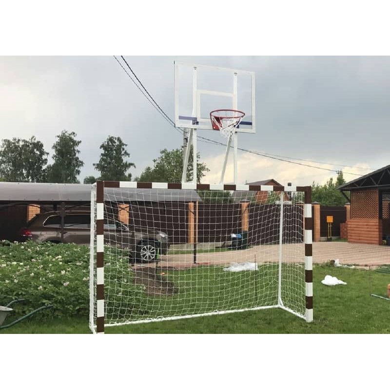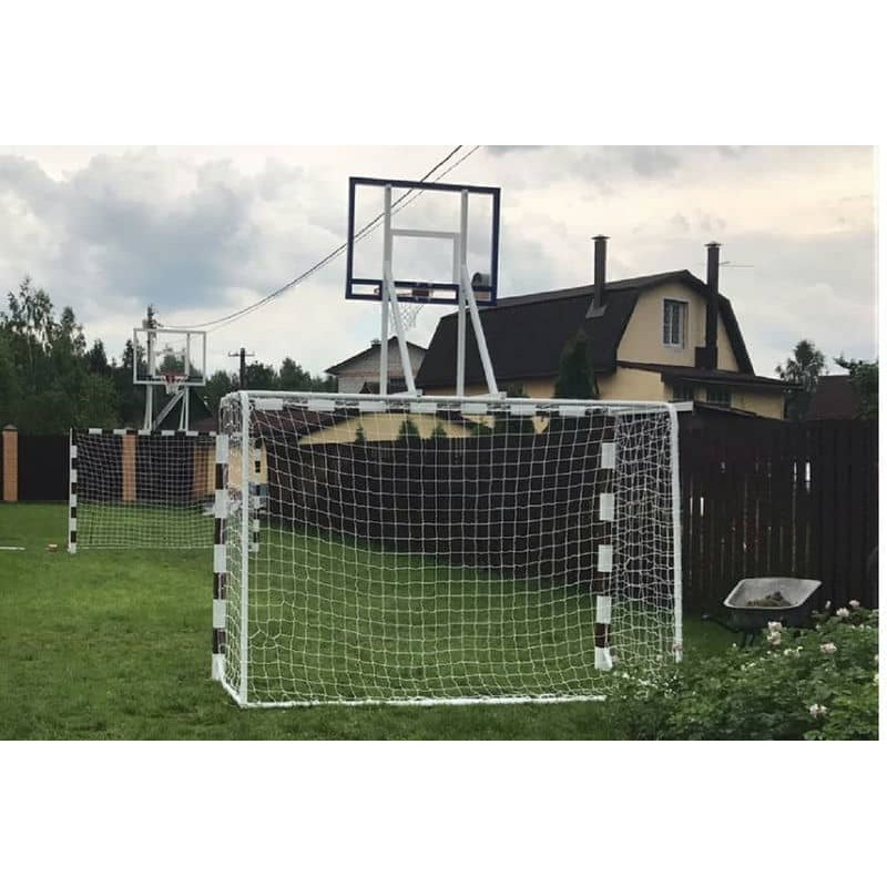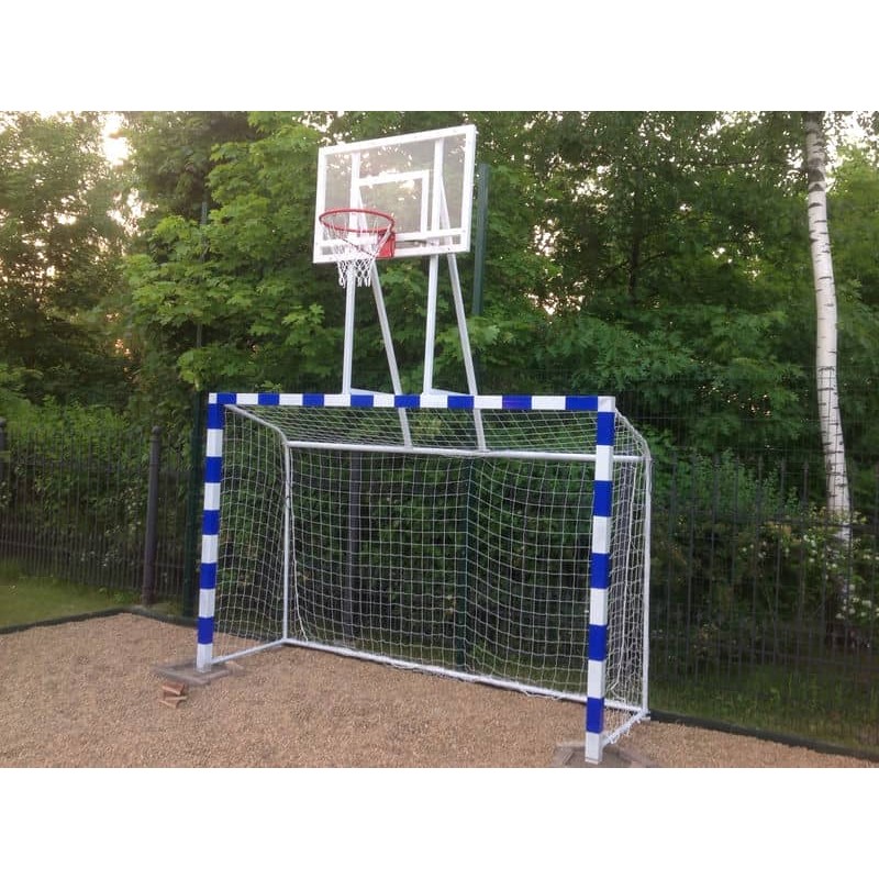 Комплект 2 в 1: розбірні ворота для міні футболу і гандболу зi смугами і баскетбольний щит з кошиком. Комплект призначений для використання на спортивних майданчиках. Сітка в комплект не входить. У комплекті йдуть 4 анкерів, які вбивають в землю і тим самим надійно закріплюють всю конструкцію. Баскетбольний щит закріплений на кріпленні, що дозволить Вам, при потребі, самостійно зняти щит. Баскетбольний щит виготовлений з оргскла і оснащений простим кошиком. Ворота виготовлені з металу і покриті полімерно-порошковим покриттям і плівкою Oracal.